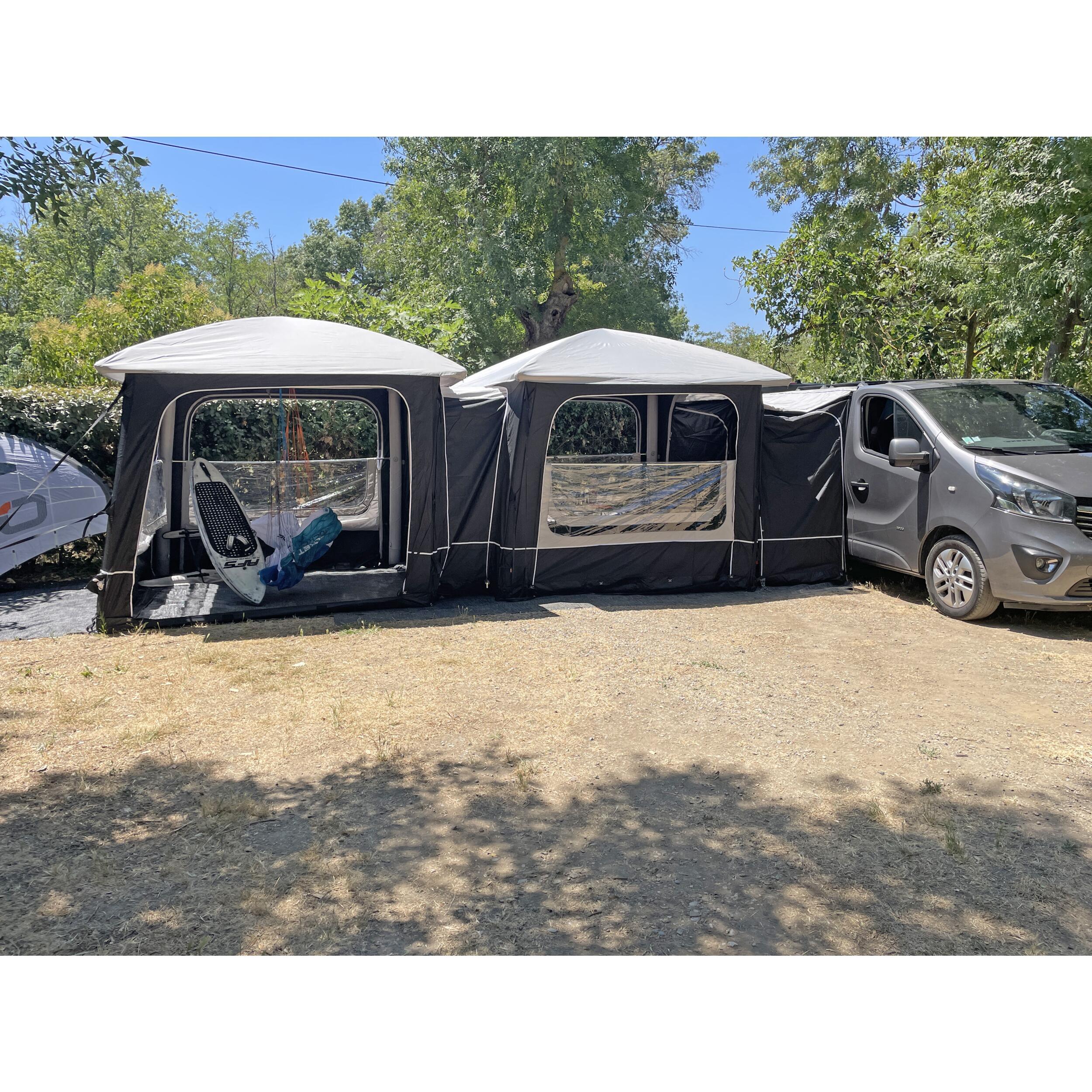 Le connecteur pour 2 abris Lodge Air se fixe facilement et solidement à chaque abri grâce à un système de fermeture à glissière. Cette méthode de fixation assure une connexion étanche et stable, même par mauvais temps. Ces dimensionsoffrent une connexion spacieuse entre les deux abris, facilitant la circulation et l'utilisation de l'espace.