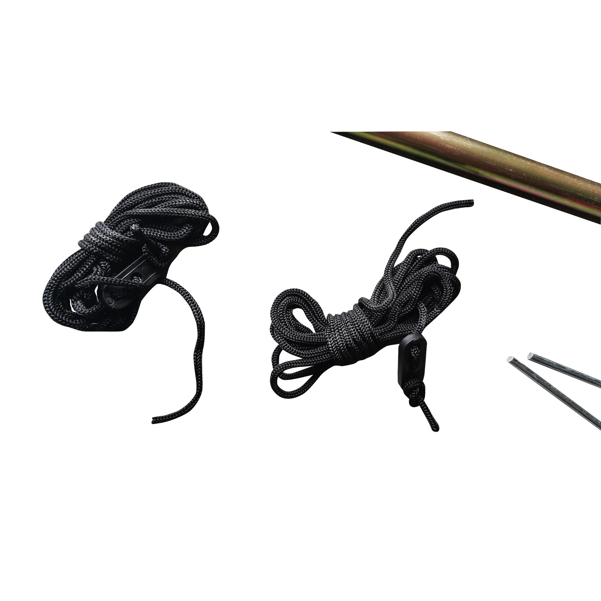 La corde et les piquets permettent de tendre et fixer l’auvent au sol.