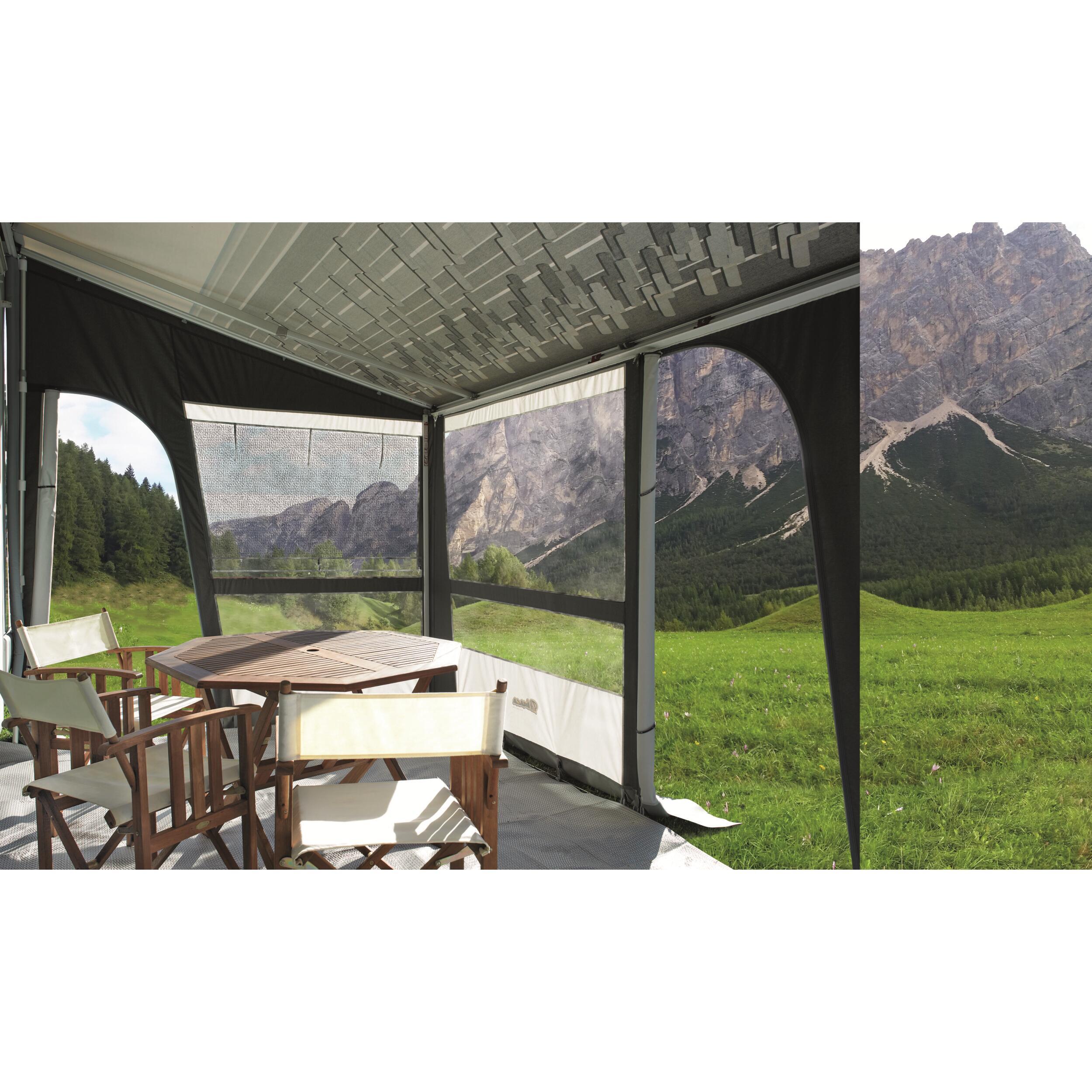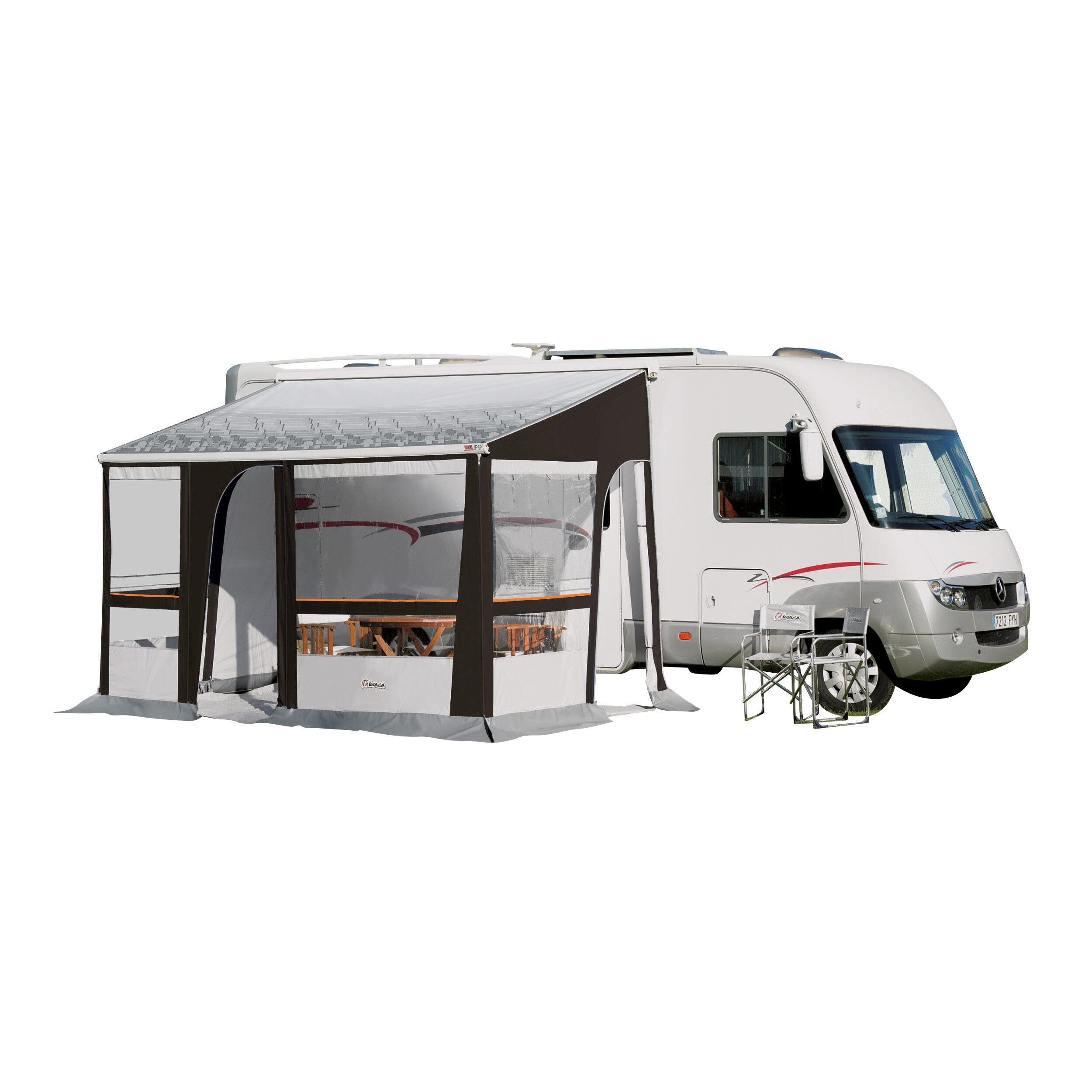 Entourage complet pour store extérieur de paroi de caravane, camping-car et fourgon dont la hauteur sous boîtier est comprise entre 2,20 et 3,05 m. Entourage évolutif conçu pour s'adapter à n'importe quelle longueur de store avec avancée de 2,50 m. Le module de base comprend une façade de 3,00 m et les deux côtés, des panneaux supplémentaires de façade avec fenêtre sont disponibles en options afind'ajuster la façade à la taille de votre store. Chaque côté est équipé d'une moustiquaire protégée par une fenêtre cristal.
