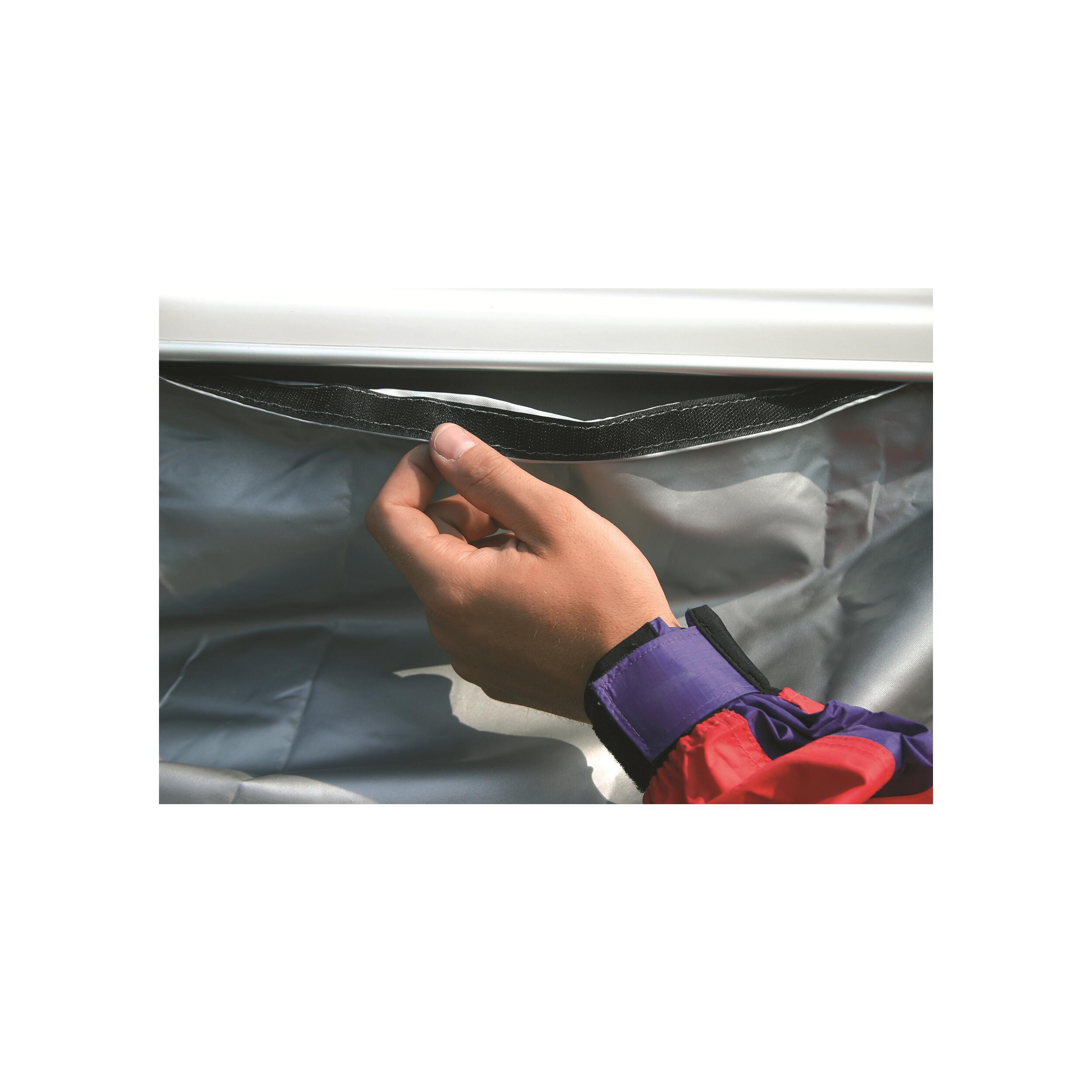 Le capuchon réalisé en nylon aluminé sert à se protéger du froid et du vent: il s’agit d’un accessoire très utile pour ceux qui voyagent dans les pays froids ou dans des endroits où l’amplitude thermique est importante. Facile d’utilisation grâce à la bande de velcro située sous le toit de Columbus. Il peut rester monté pendant le voyage. Le capuchon hivernal est douée d’une porte (côté conducteur) et d’une fenêtre (côté passager).