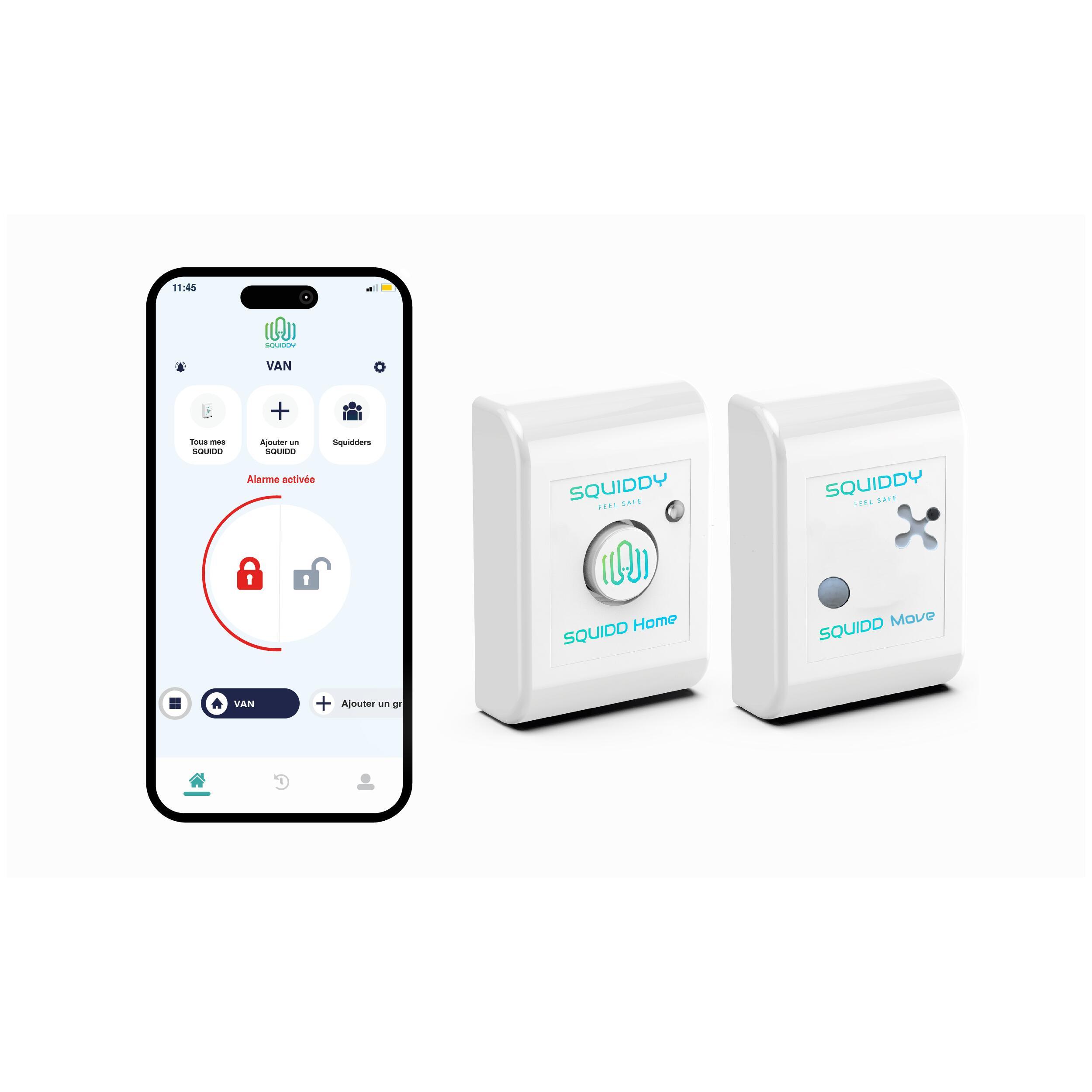 Le cœur du Pack Confort est le SQUIDD Home, une centrale de sécurité ultra-compacte, de la taille d’une carte de crédit, qui combine trois fonctions essentielles pour une protection optimale. Agissant à la fois comme détecteur de chocs, vibrations et ouvertures, il est doté d’une puissante sirène intégrée de plus de 95dB pour dissuader toute tentative d'intrusion. Connecté et autonome, le SQUIDD Home vous alerte immédiatement en cas de détection via SMS, e-mail ou notifications de l'application SQUIDDY. Cette alarme intelligente vous permet de garder le contrôle, où que vous soyez.
