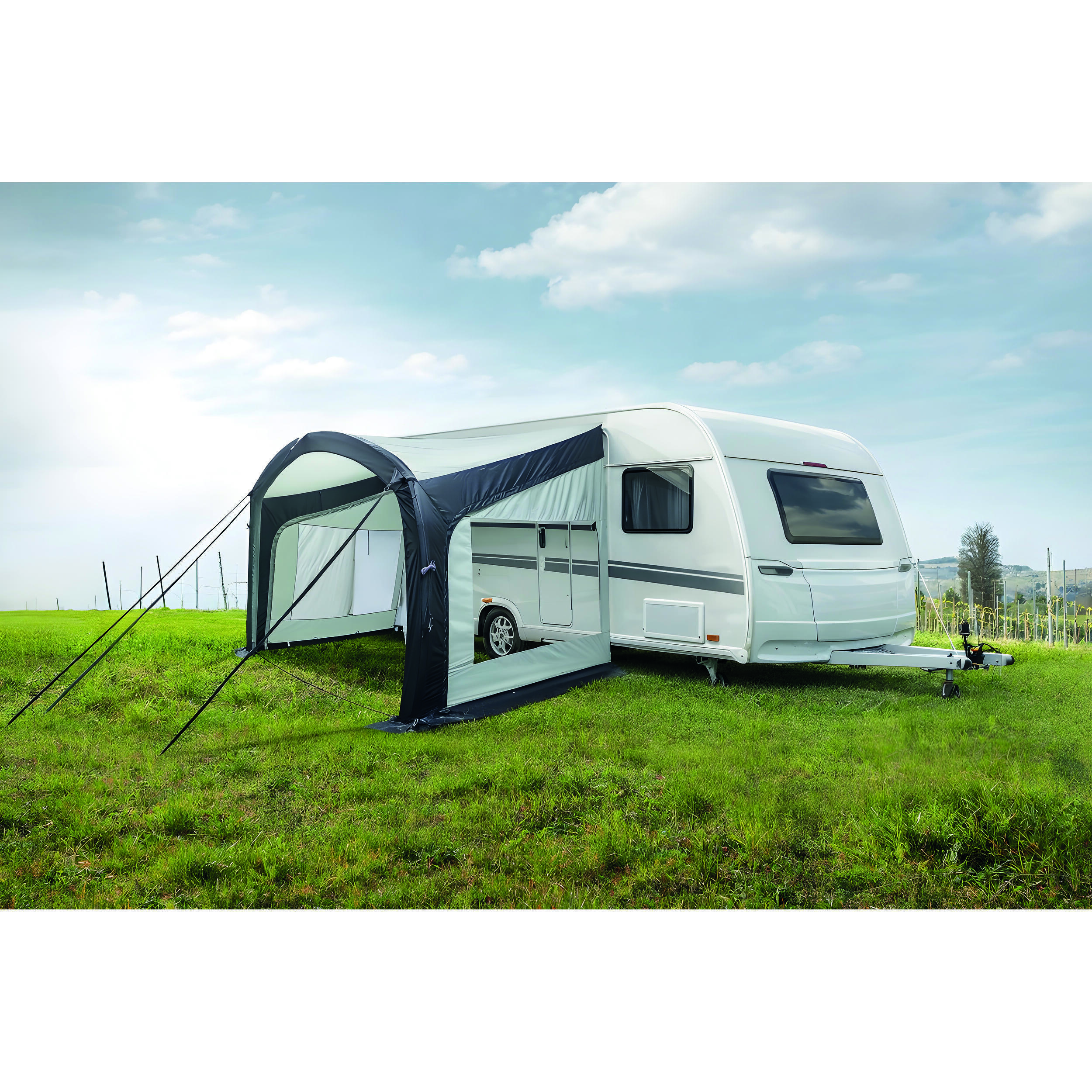 Ombréa Air de Baya Sun : L'Innovation Gonflable pour Vos Séjours en Plein AirMontage Rapide et Facile : Profitez Plus, Montez MoinsL'Ombréa Air de la marque Baya Sun révolutionne le concept des solettes pour caravanes. Avec une hauteur de montage entre 235 et 250 cm, elle s'adapte parfaitement à la majorité des véhicules de loisirs. Son atout principal réside dans son système de gonflage en un seul point, permettant une installation et un démontage ultra-rapides. En quelques minutes, vous créez un espace de vie supplémentaire devant votre véhicule, idéal pour se détendre à l'ombre tout en profitant du plein air. Fini les installations complexes et longues, place à la simplicité et à l'efficacité.Confort et Fraîcheur : Un Toit Qui Protège du SoleilLa solette Ombréa Air n'est pas seulement pratique, elle est aussi pensée pour votre confort. Son toit gris clair a été conçu pour attirer moins le soleil, garantissant ainsi un coin de fraîcheur sous votre abri. Ce choix de couleur intelligent vous permet de profiter des belles journées d'été sans subir la chaleur écrasante. Que ce soit pour déjeuner en famille, lire un bon livre ou simplement se reposer, l'Ombréa Air vous offre un espace confortable et protégé des rayons UV.Légèreté et Résistance : Des Matériaux de Qualité SupérieureFabriquée en polyester 150D, la solette Ombréa Air est trèslégère. Pesant seulement 5,8 kg, elle se transporte aisément grâce au sac inclus, vous permettant de l'emporter partout avec vous. Malgré sa légèreté, le polyester utilisé assure une excellente résistance aux petites intempéries. Les sangles anti-vent incluses garantissent une stabilité parfaite même en cas de petites rafales, tout en permettant de tendre la toile pour un rendu esthétique optimal. Vous avez également la possibilité d'ajouter des murs latéraux en option, facilement installables grâce à des glissières à zip, pour créer un véritable cocon convivial et protégé.