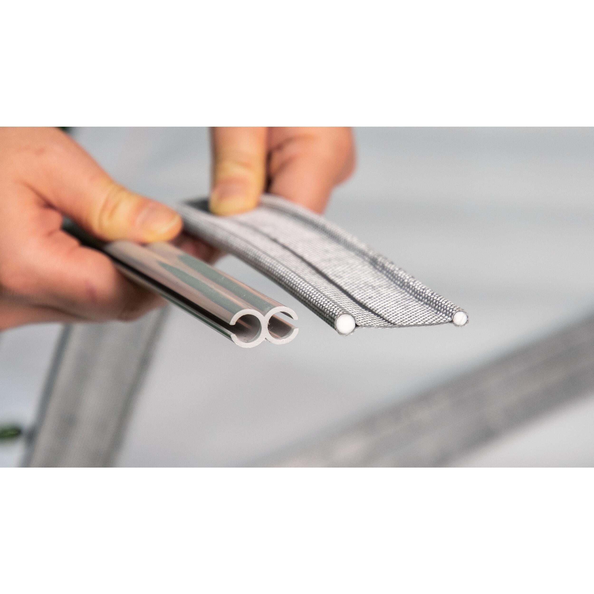 Avec son système de double jonc (7/6 mm ou 5/4 mm), ce kit s'adapte à la majorité des véhicules et auvents, garantissant une installation sans effort. La bande de jonc se glisse simplement dans le rail de jonc du véhicule, et grâce au rail à double profil, le bourrelet de l'auvent se connecte aisément, permettant une intégration parfaite.