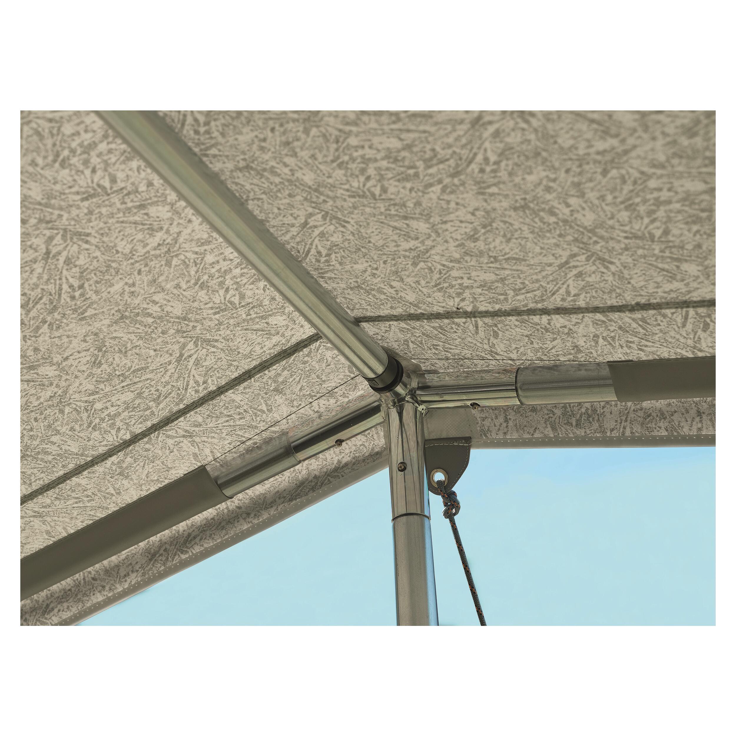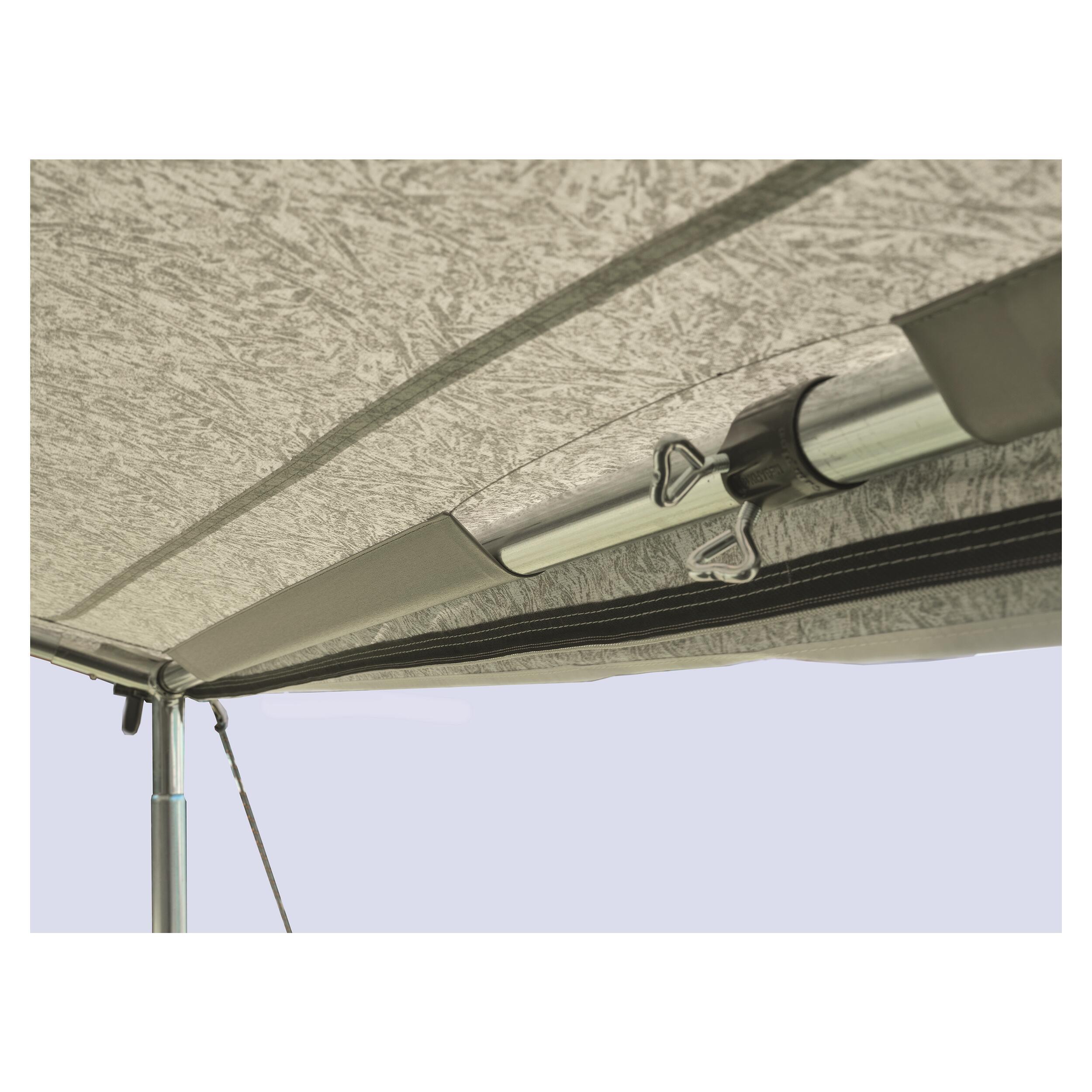 Atlas se monte sur la casquette de votre auvent grâce à 3 Mega F-link. ce qui permet de créer une terrasse ombragée en doublant la superficie sous le toit.