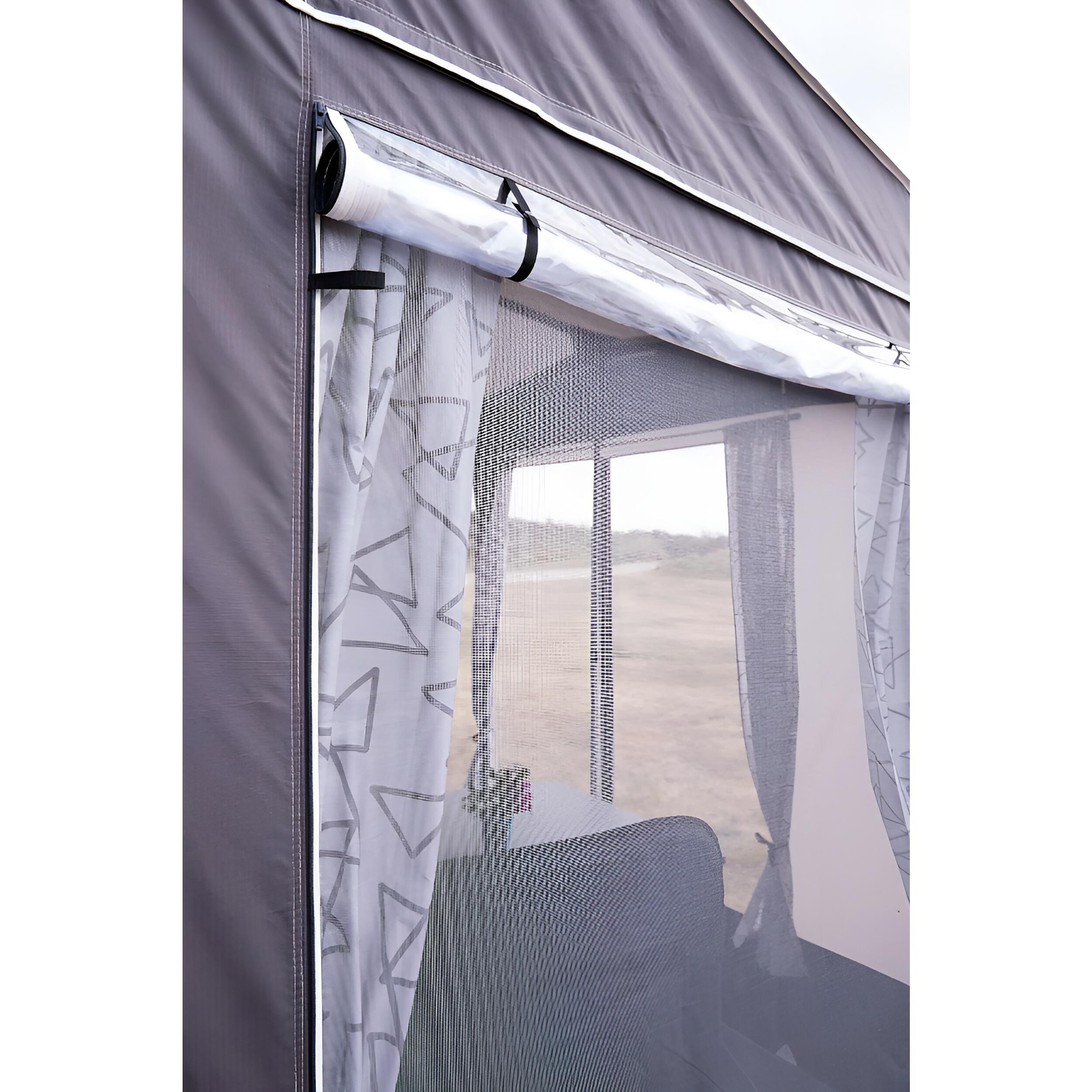 Pack Fenêtre Pacific : ajoutez lumière, ventilation et intimité à votre auvent Isabella avec 4 volets équipés d’œillets PVC, fermeture ovale et moustiquaire intégrée.