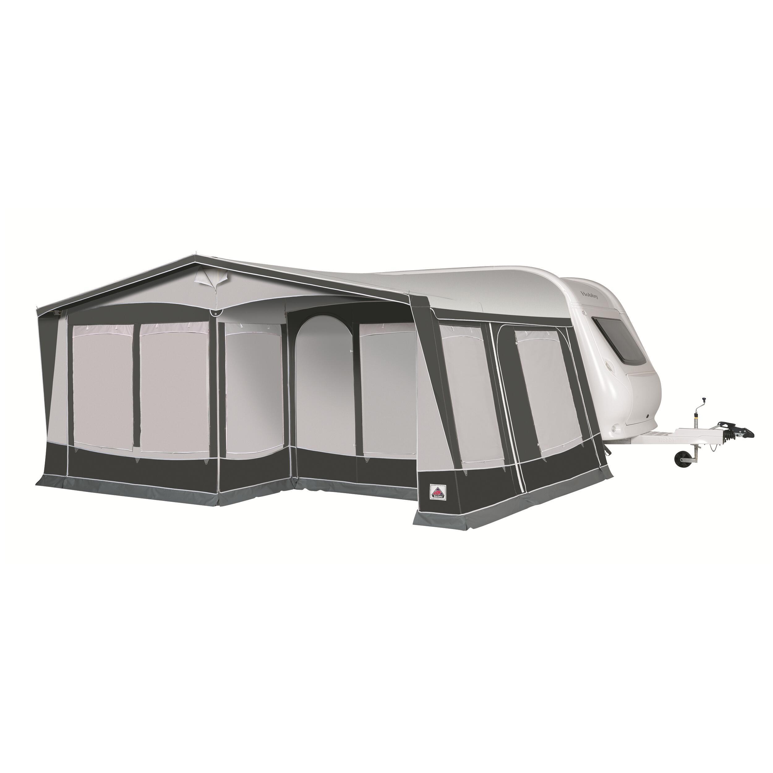 Sectionnement flexible de la façade. Le patio couvert peut être créé en déplaçant vers l'intérieur un seul ou les 2 panneaux de façade (mur perpendiculaire de séparation à prévoir en option). Aération par moustiquaire réglable par fermeture à glissières.
