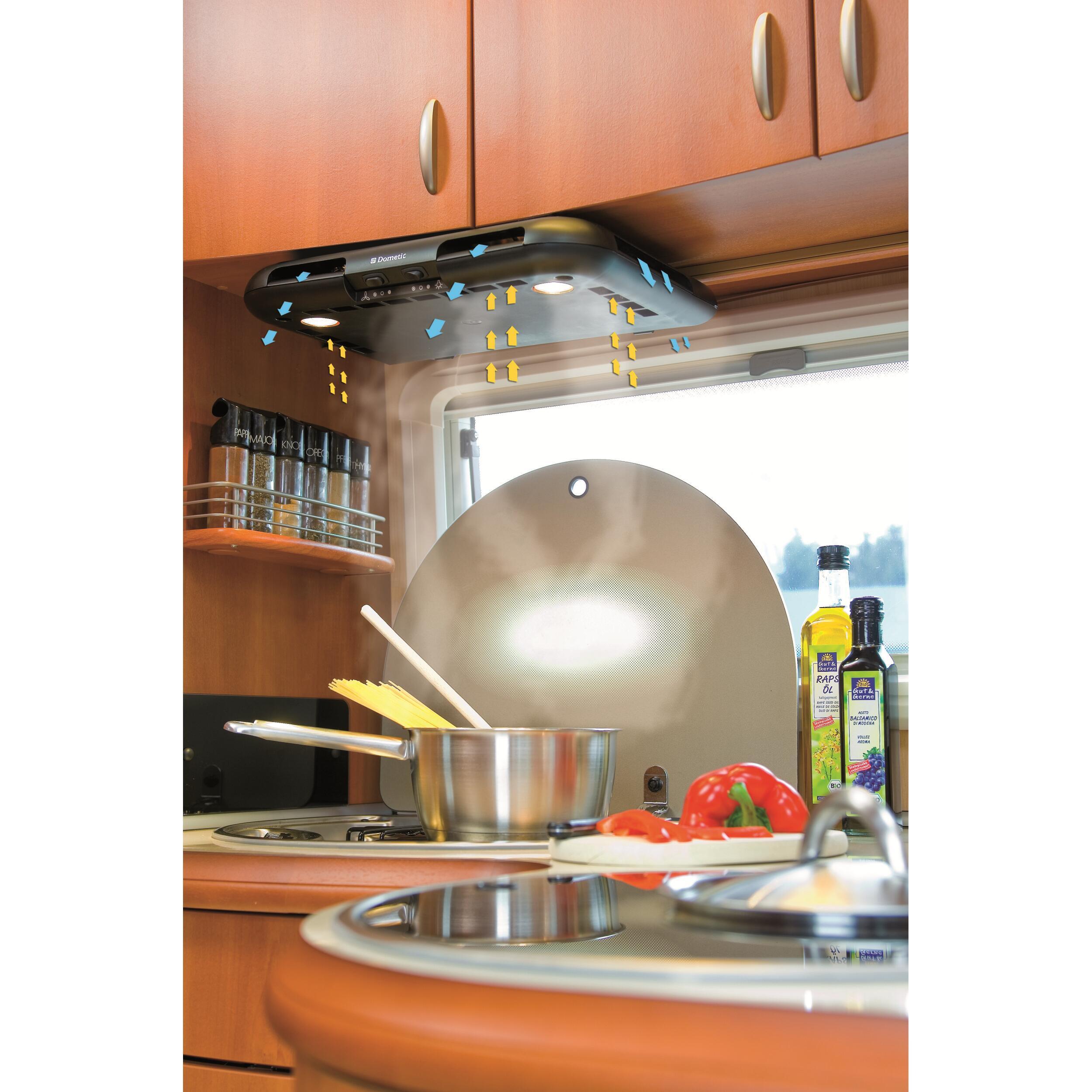 la hotte CK 2000 de Dometic évacue efficacement la fumée vers le haut et au centre tout en expulsant l'air propre via des orifices frontaux et latéraux, ce qui évite d'installer un extracteur de toit.