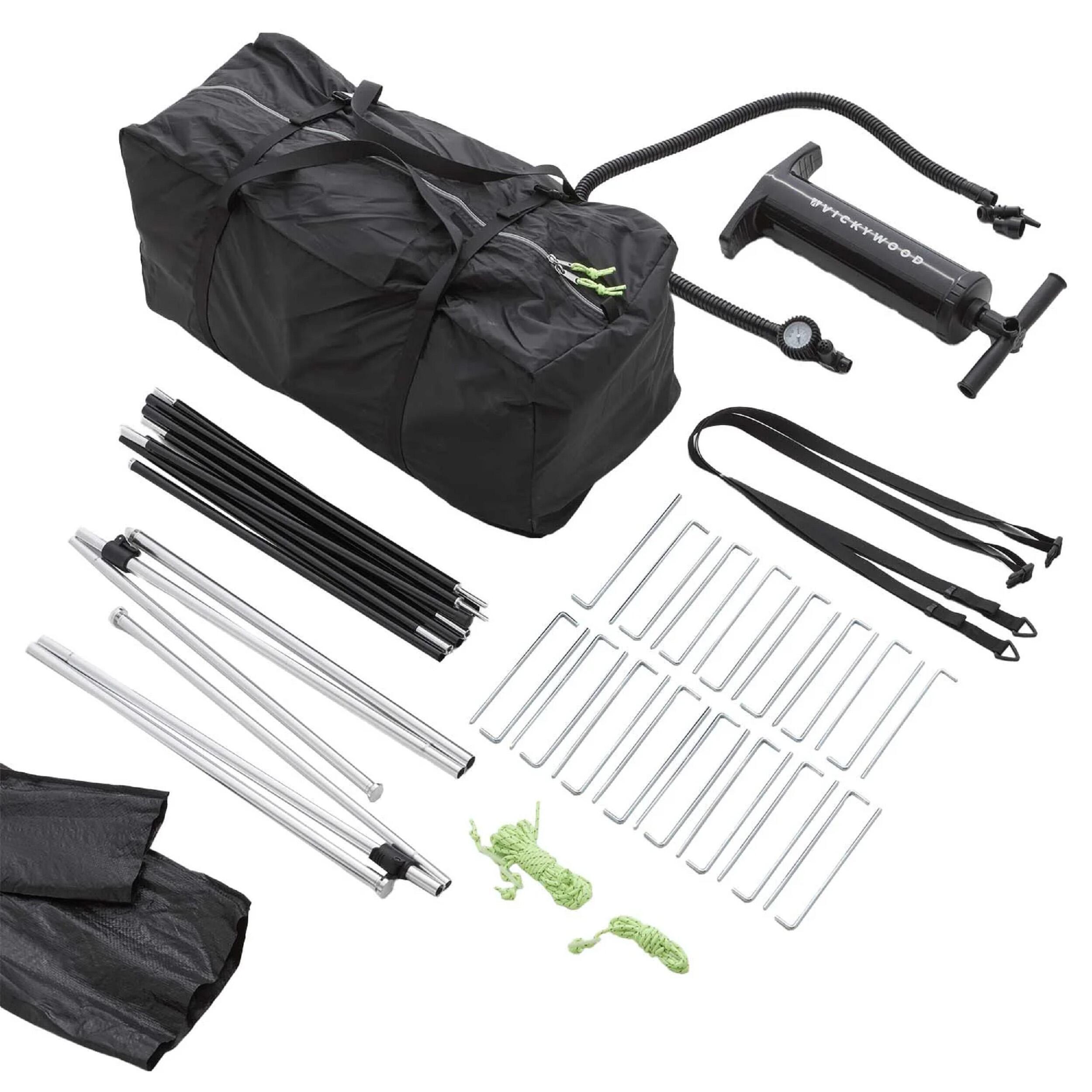 La VICKYWOOD AIRTENT 140 est livrée avec tous les accessoires indispensables à son installation : pompe à main à double action, haubans, piquets, tiges d’aluminium et sac de transport robuste. Le cadre est composé de chambres à air en TPU de 10 cm de diamètre, renforcées par trois tiges en aluminium pour plus de tenue. Une fois repliée, elle se range facilement dans un sac compact (73 x 32 x 32 cm) pour un transport sans encombrement.