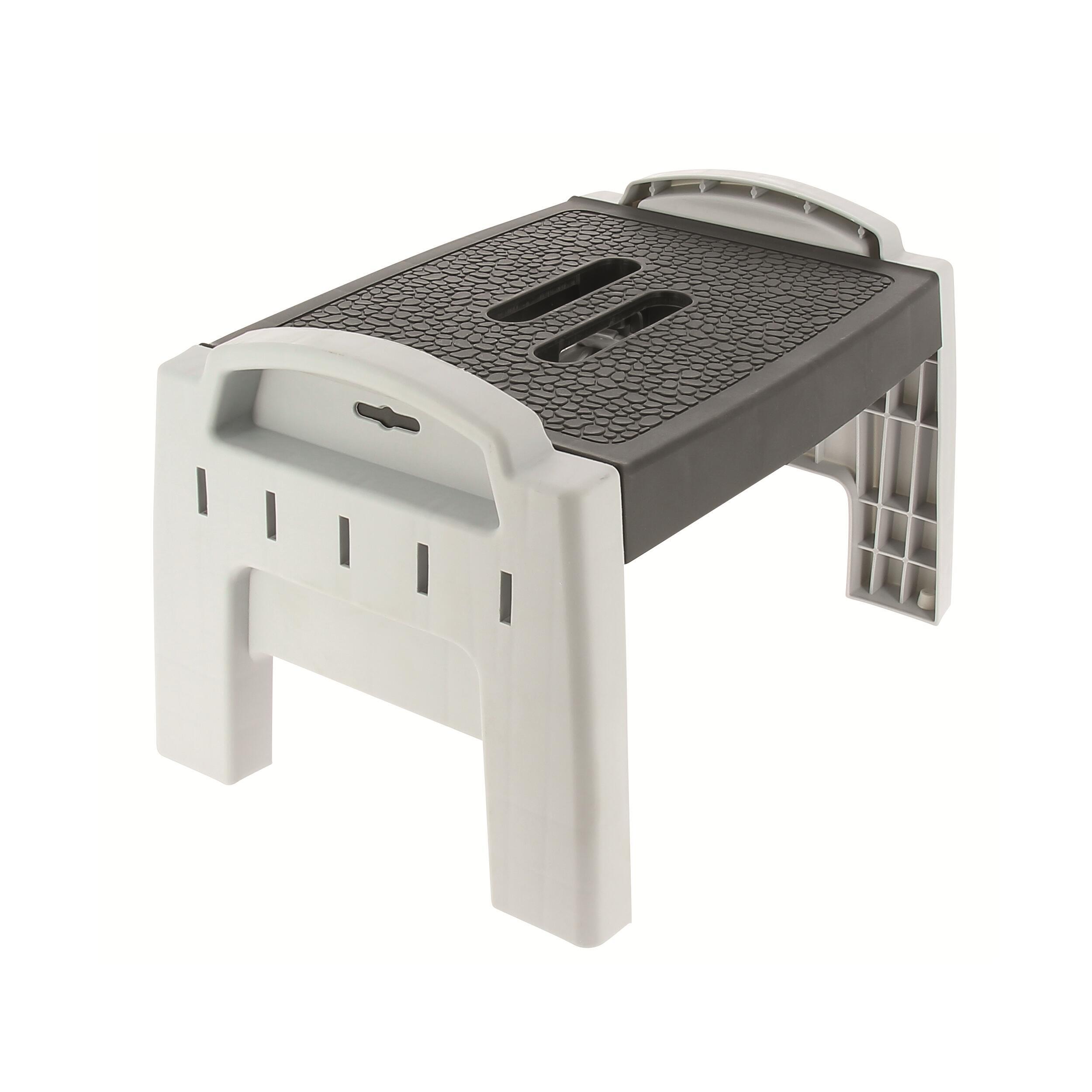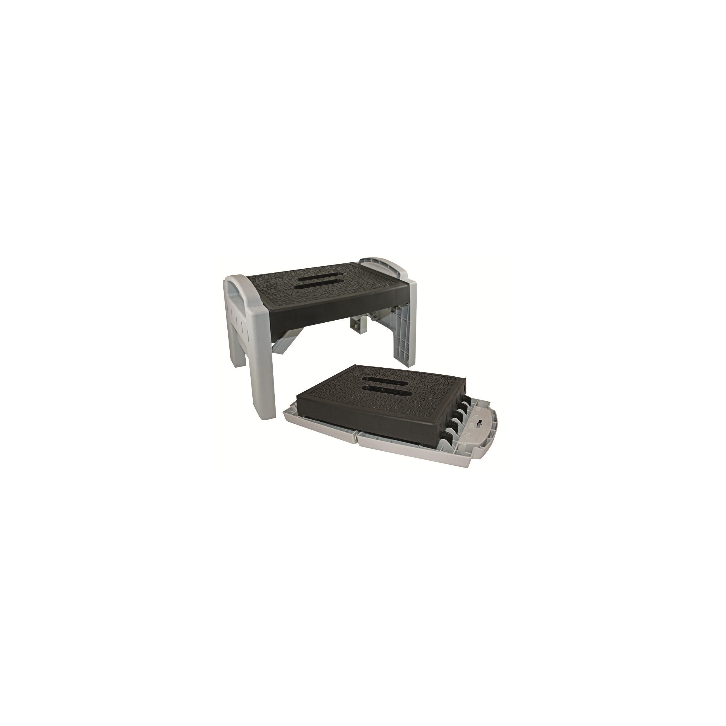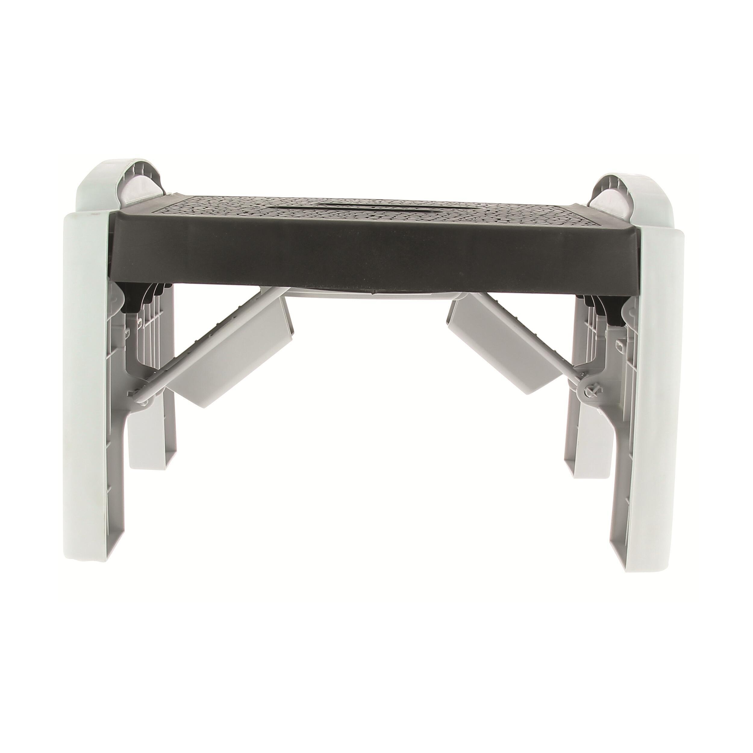 En plastique. Surface antidérapante et pieds rabattables. Compact une fois plié.