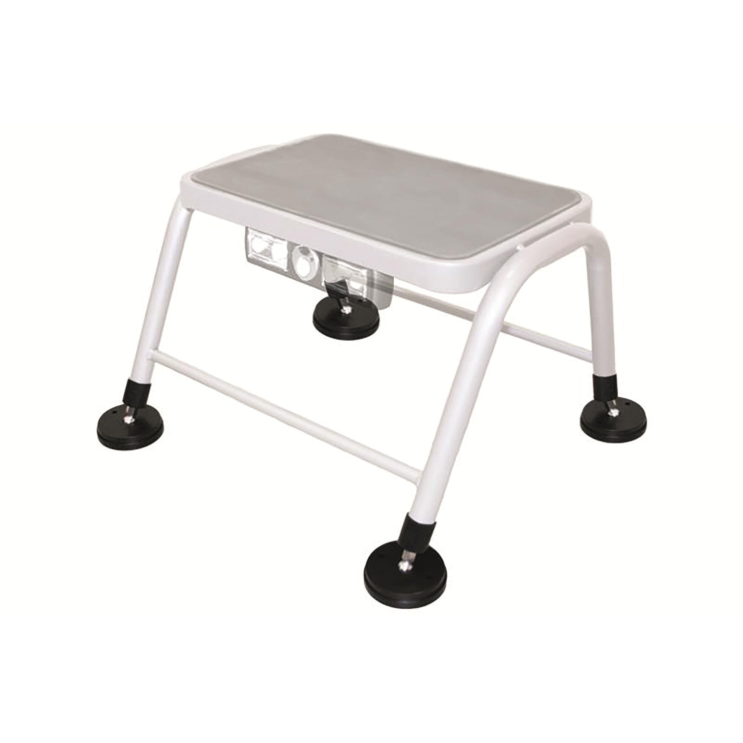Chaque pied peut être réglé en hauteur sur une plage de plus ou moins 10 mm. Ce réglage est utile lorsque le marchepied est bancale. La platine est montée sur un axe rotatif et pivotant afin de s’adapter au sol.