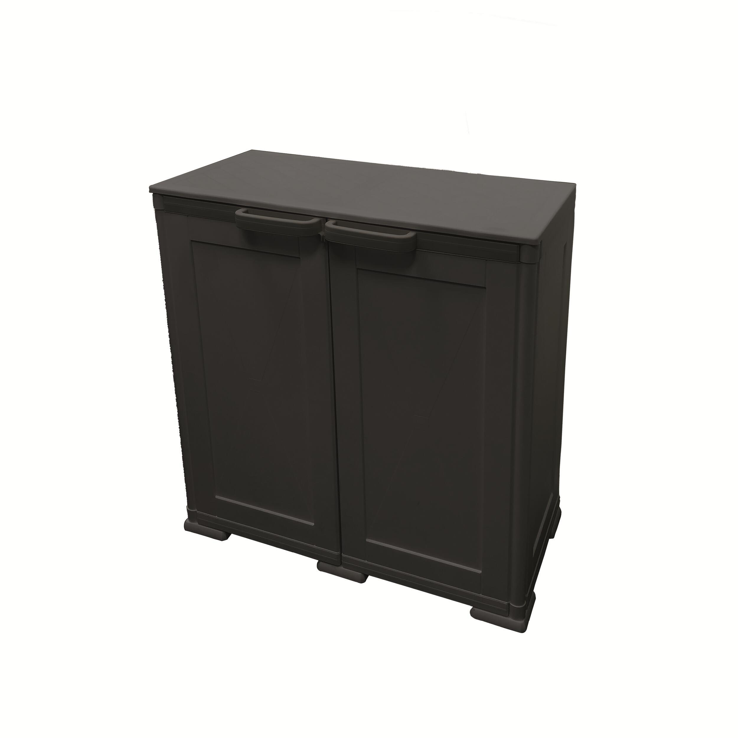 Armoire de rangement solide pour le campeur sédentaire. L'armoire de rangement à portes est en matériau solide, résistant aux conditions climatiques changeantes. Elle supporte l'humidité et est imperméable. Une fixation sous la poignée permet de verrouiller l'armoire avec un cadenas.