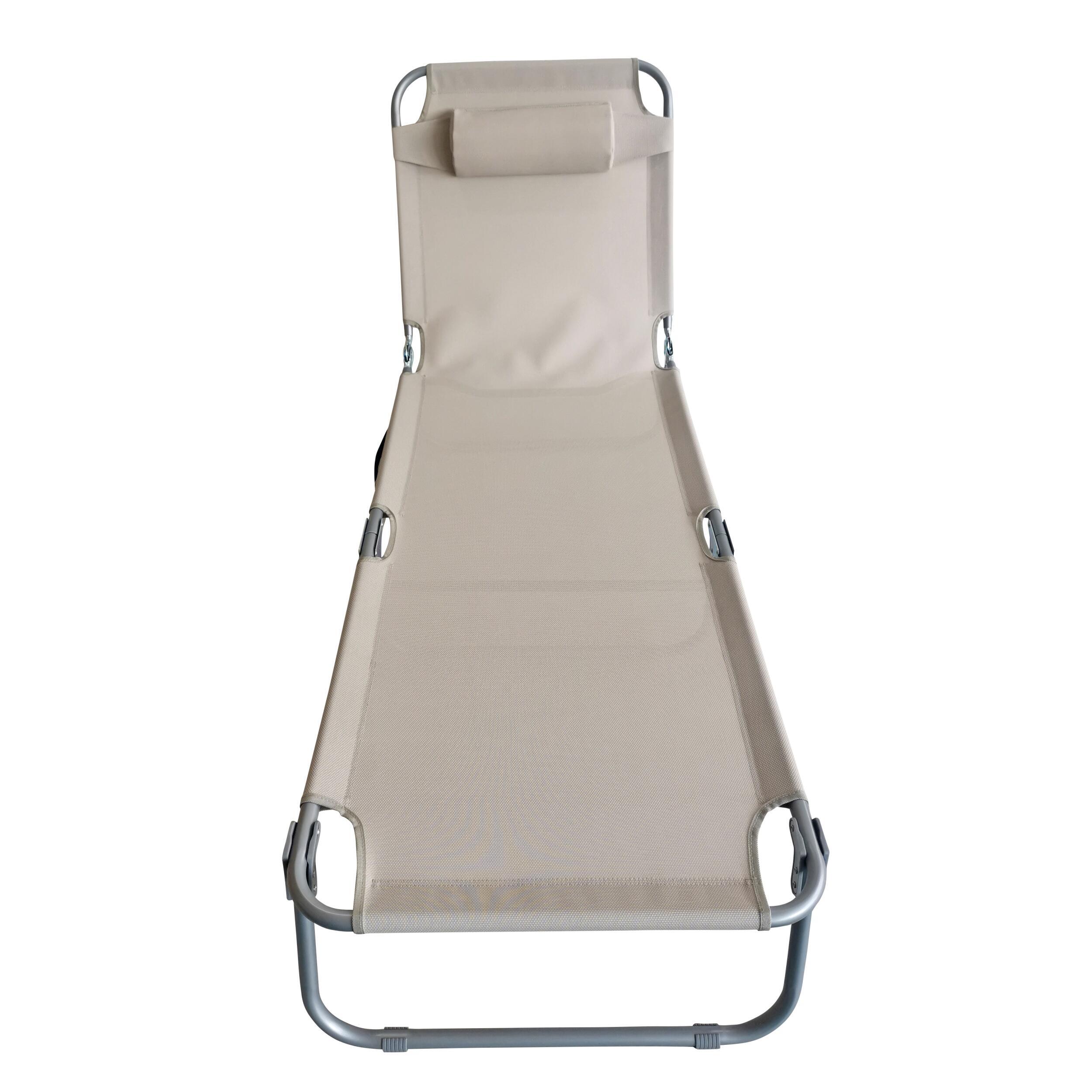 Bain de soleil en textilène avec armature en acier. Dossier inclinable en 5 positions : de l'assise à l'allongement total. Avec repose-tête amovible et poche de rangement sur le côté.