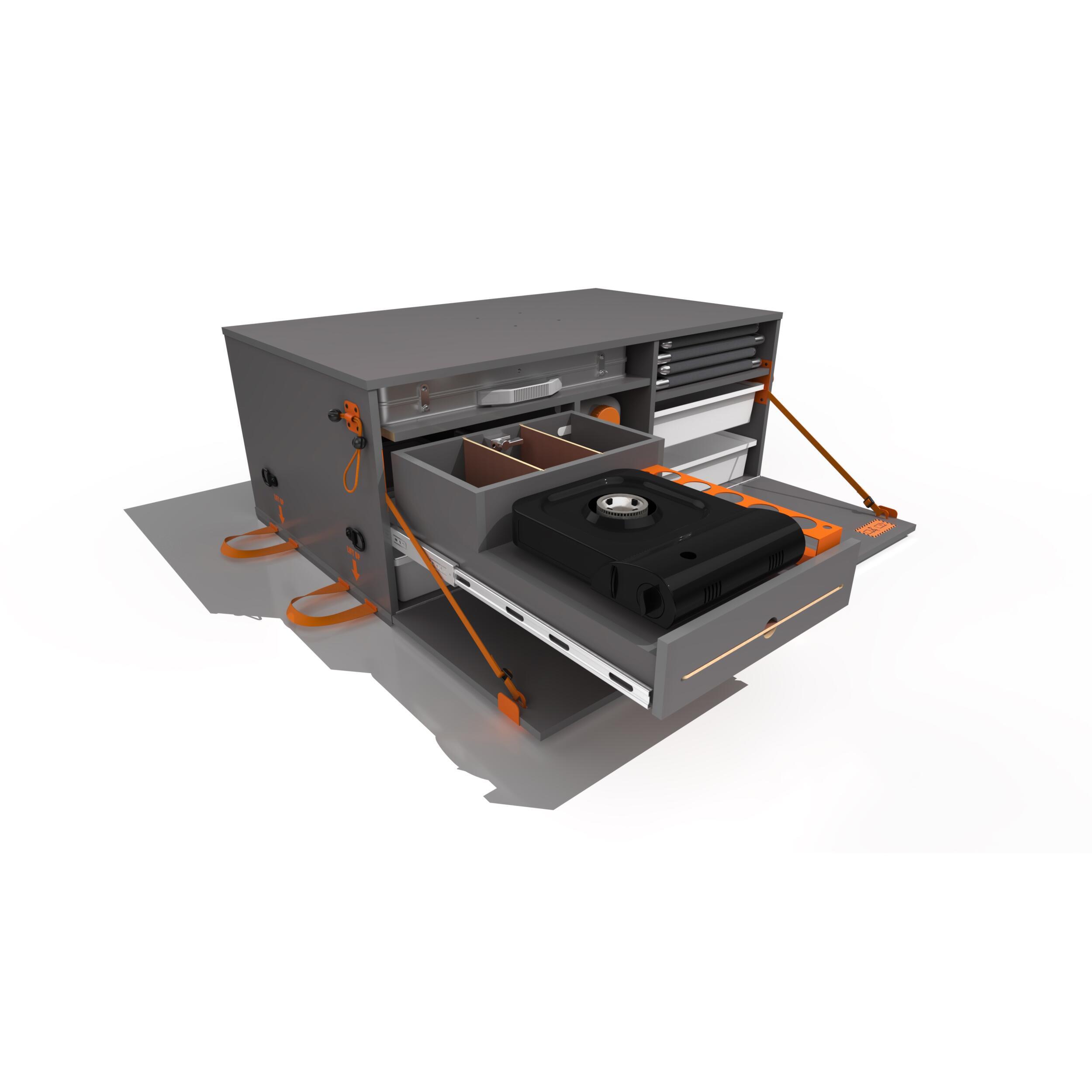 - 1 tiroir avec : Réchaud gaz 1 feux à cartouche, range épices latéral, rangement modulables de 1 à 3 parties à l'arrière du réchaud. Une tablette sous le réchaud pouvant servir de table à découper.