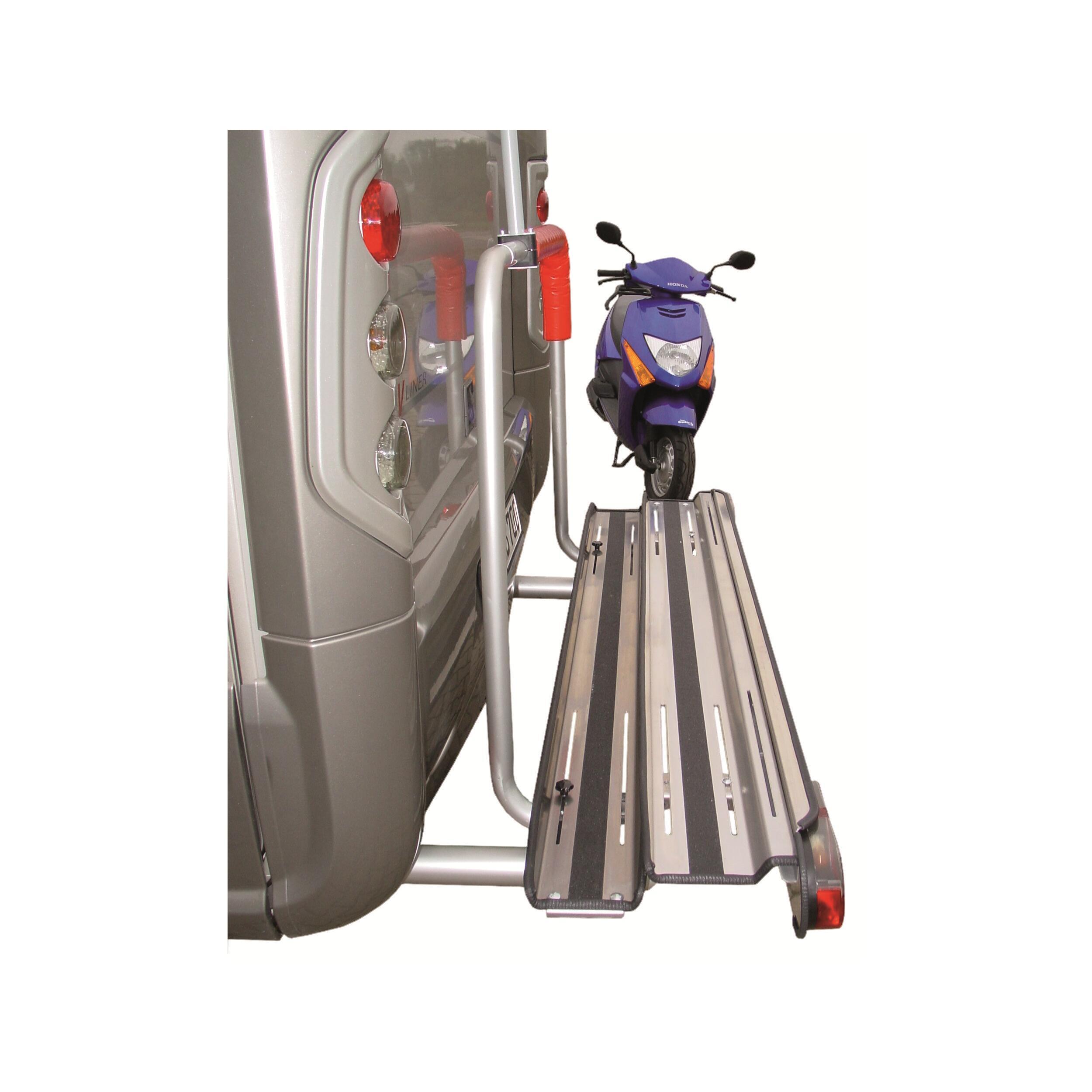 Porte-moto sur châssis en acier galvanisé et aluminium, particulièrement léger. Le rail et la rampe d'accès sont équipés d'un revêtement antidérapant garantissant une bonne adhérence des pneus.
