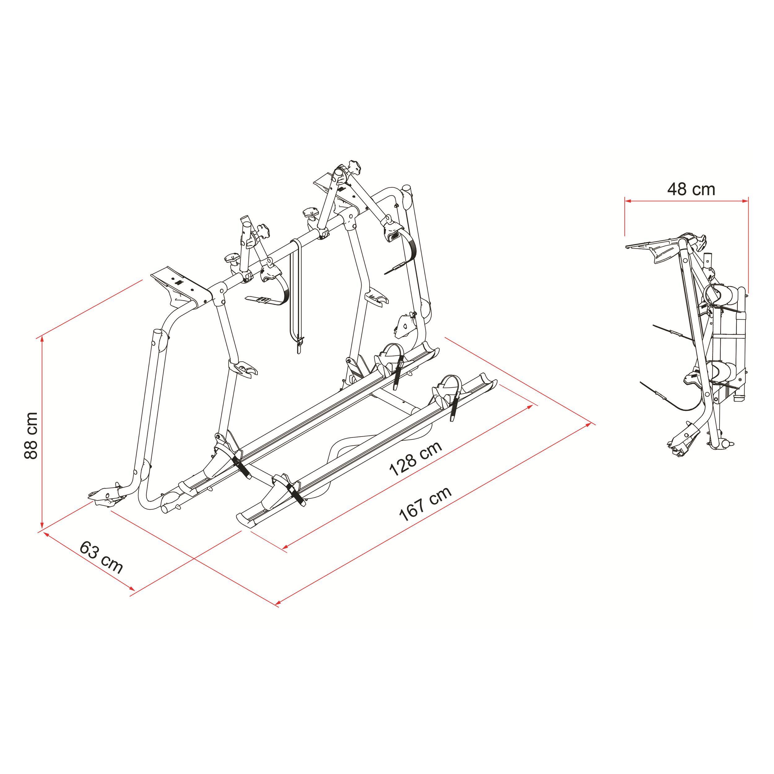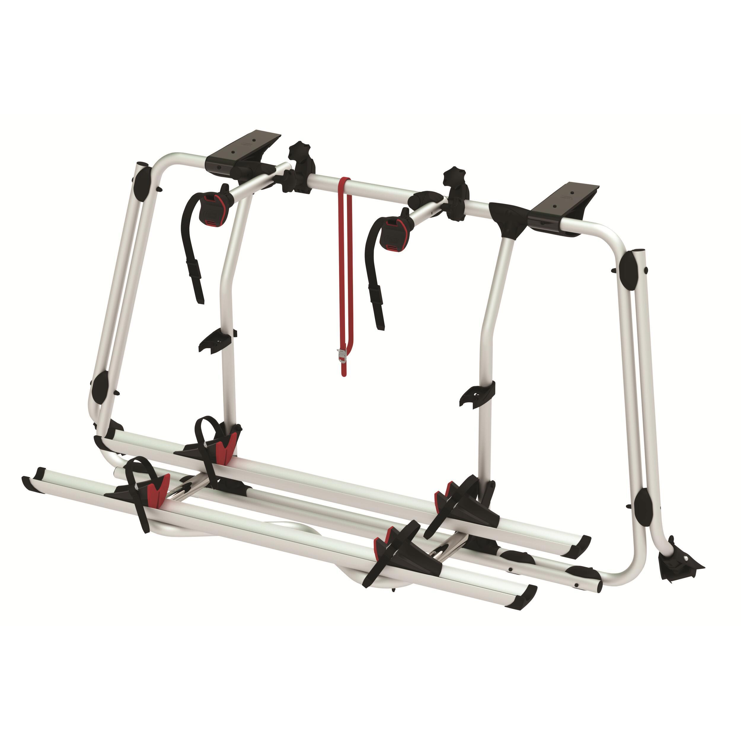 Le Carry-Bike permet de transporter 2 vélos (ou plus selon les modèles) avec un maintien optimal. Les vélos sont fixés à l’aide de rails en aluminium solides, de bras de maintien réglables et d’une sangle de sécurité Fiamma Security Strip fournie de série, pour une parfaite tenue sur route, même en cas de freinage brusque ou de virage serré.