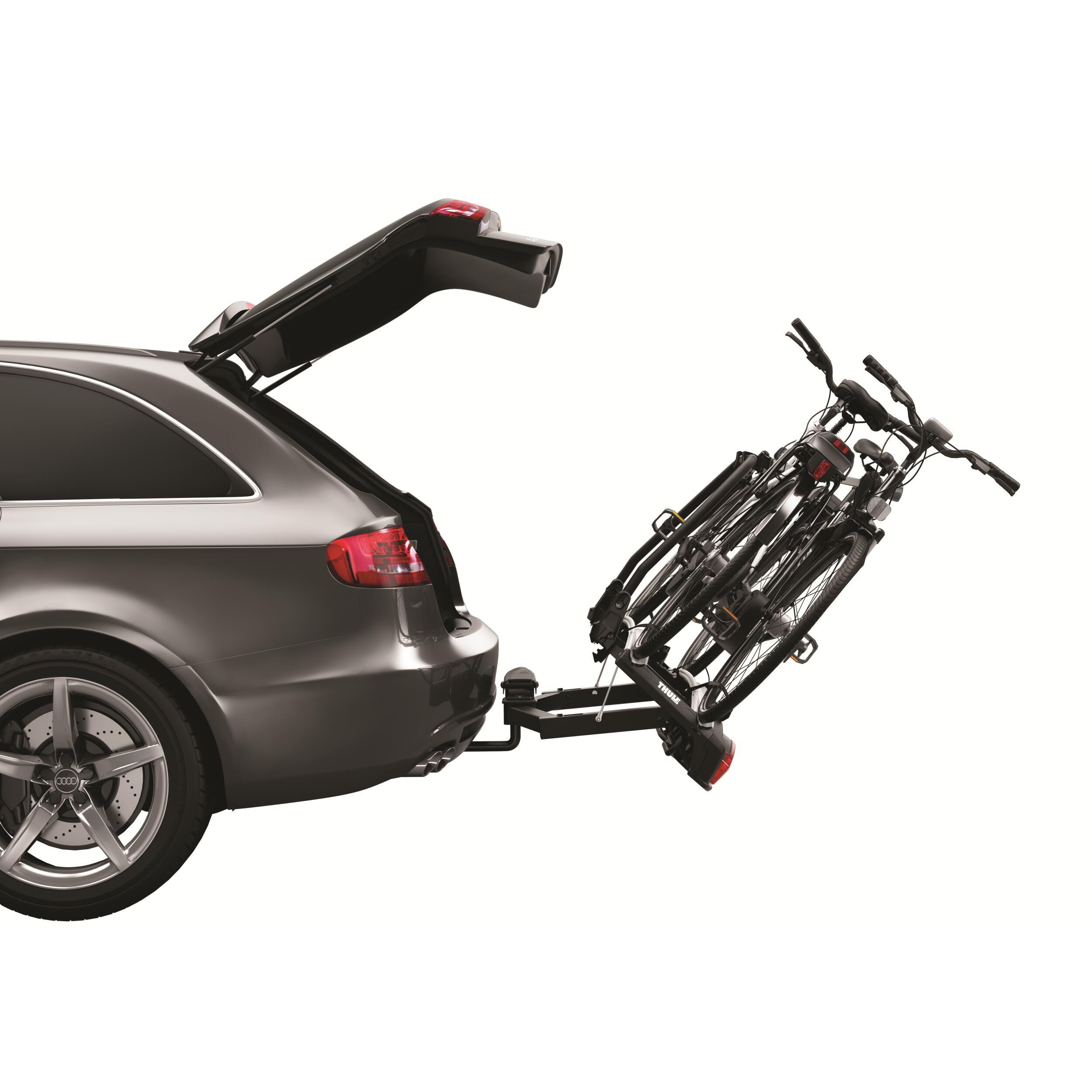 Le Thule VeloSpace XT 13PIN est un porte-vélos sur boule d'attelage, offrant un accès facile au coffre même avec les vélos fixés et se rangeant facilement lorsqu'il n'est pas utilisé.