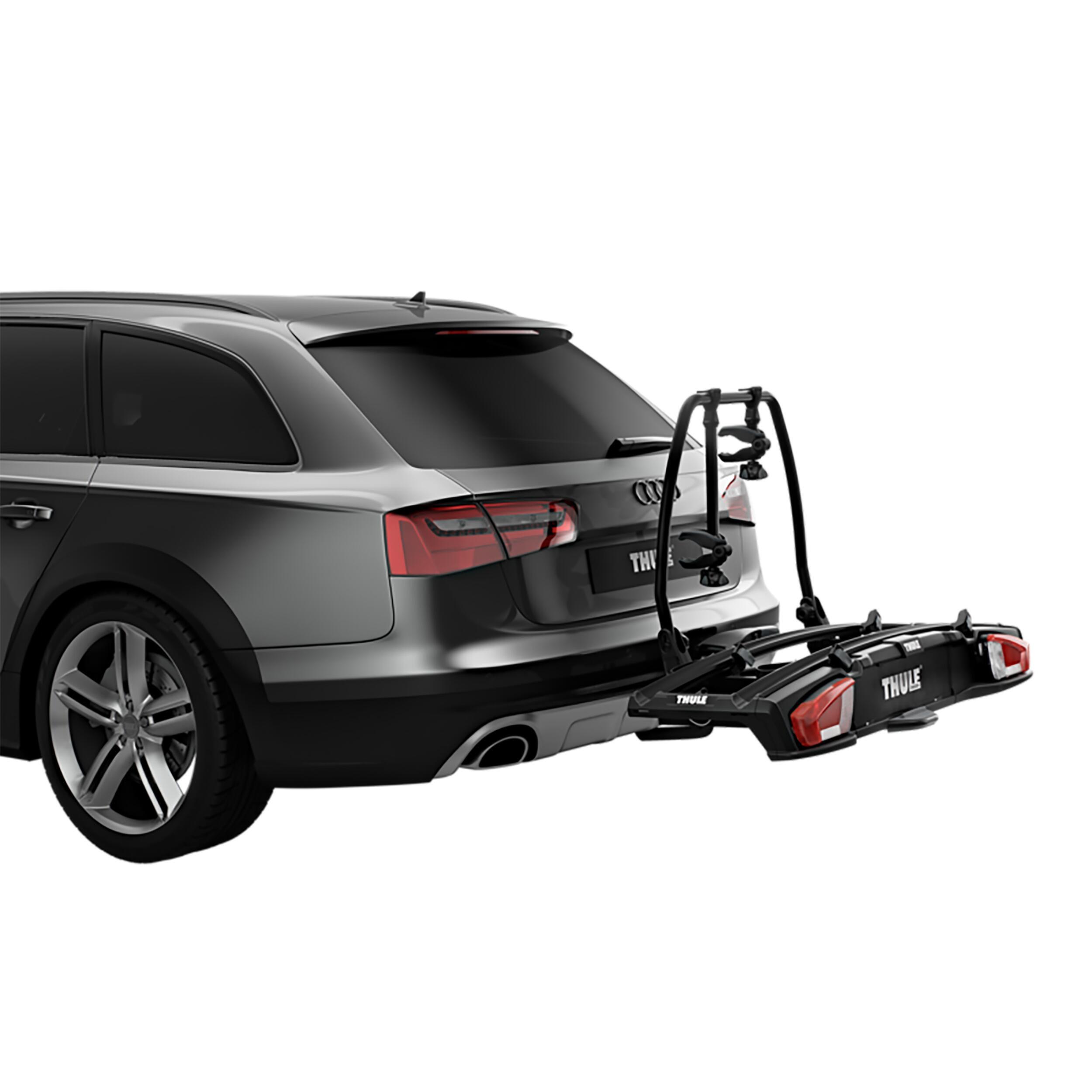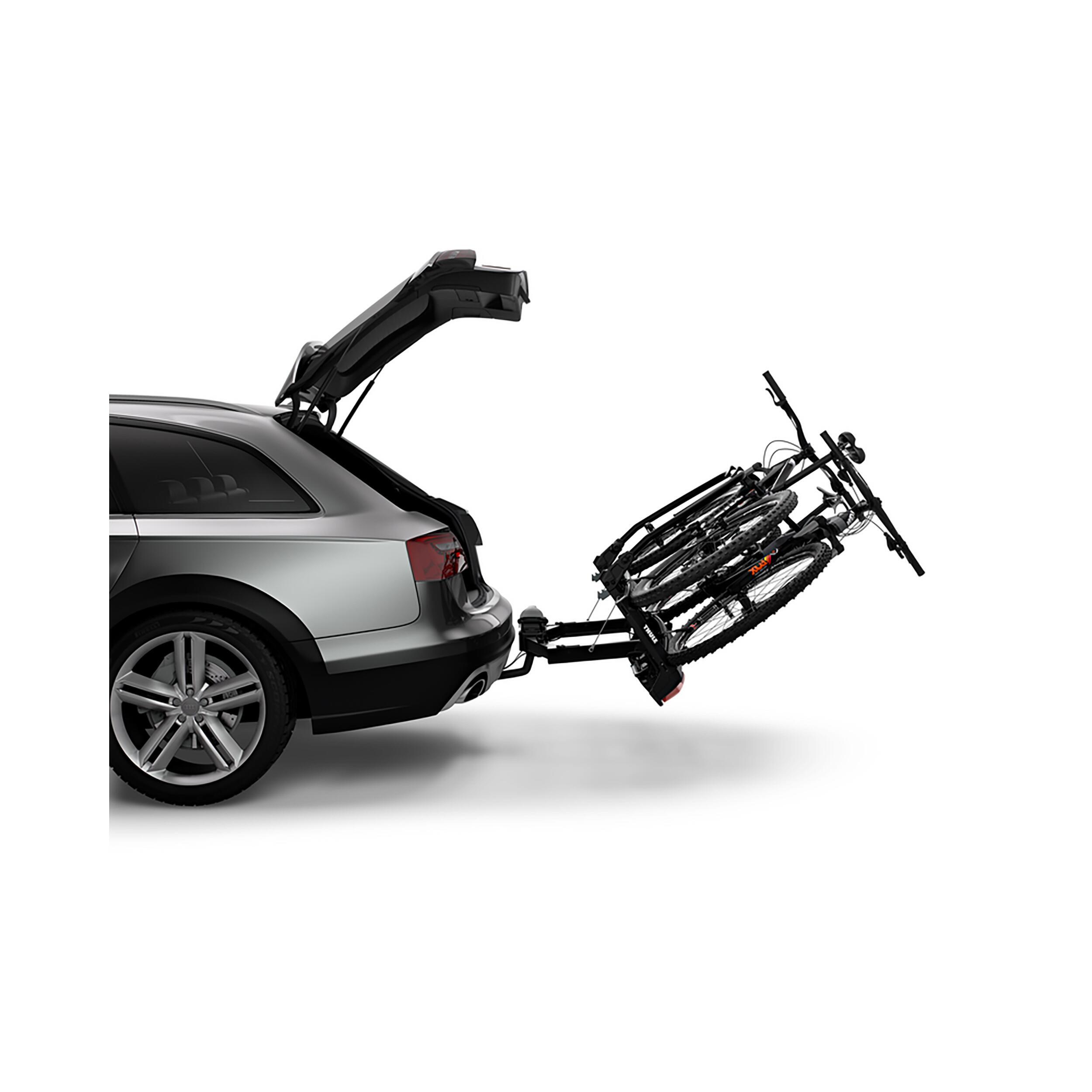 Le Thule VeloSpace XT 13PIN est un porte-vélos sur boule d'attelage, offrant un accès facile au coffre même avec les vélos fixés et se rangeant facilement lorsqu'il n'est pas utilisé.