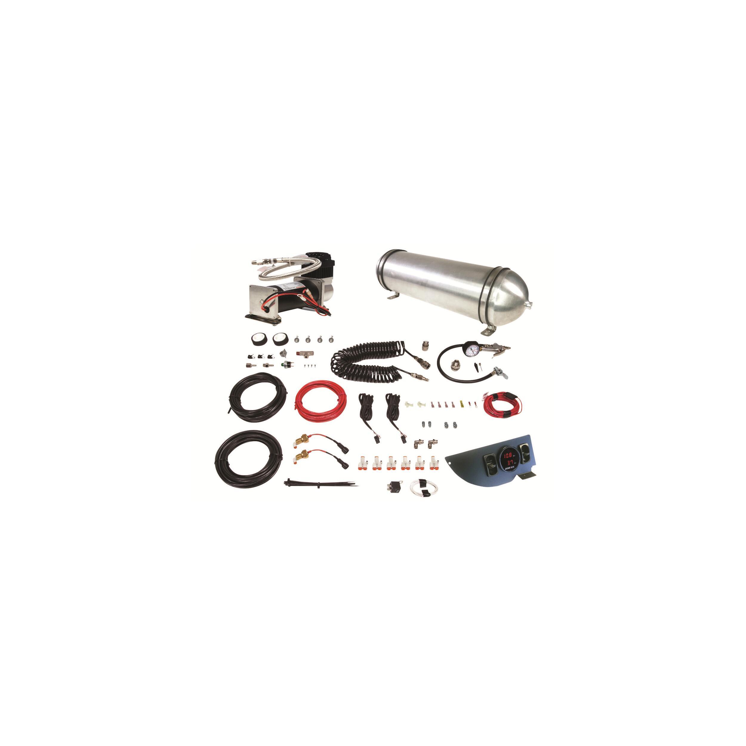 Kit complet de gestion de l'air avec compresseur renforcé, manomètre digital, réserve en aluminium et accessoires de gonflage pour pneumatiques et loisirs.