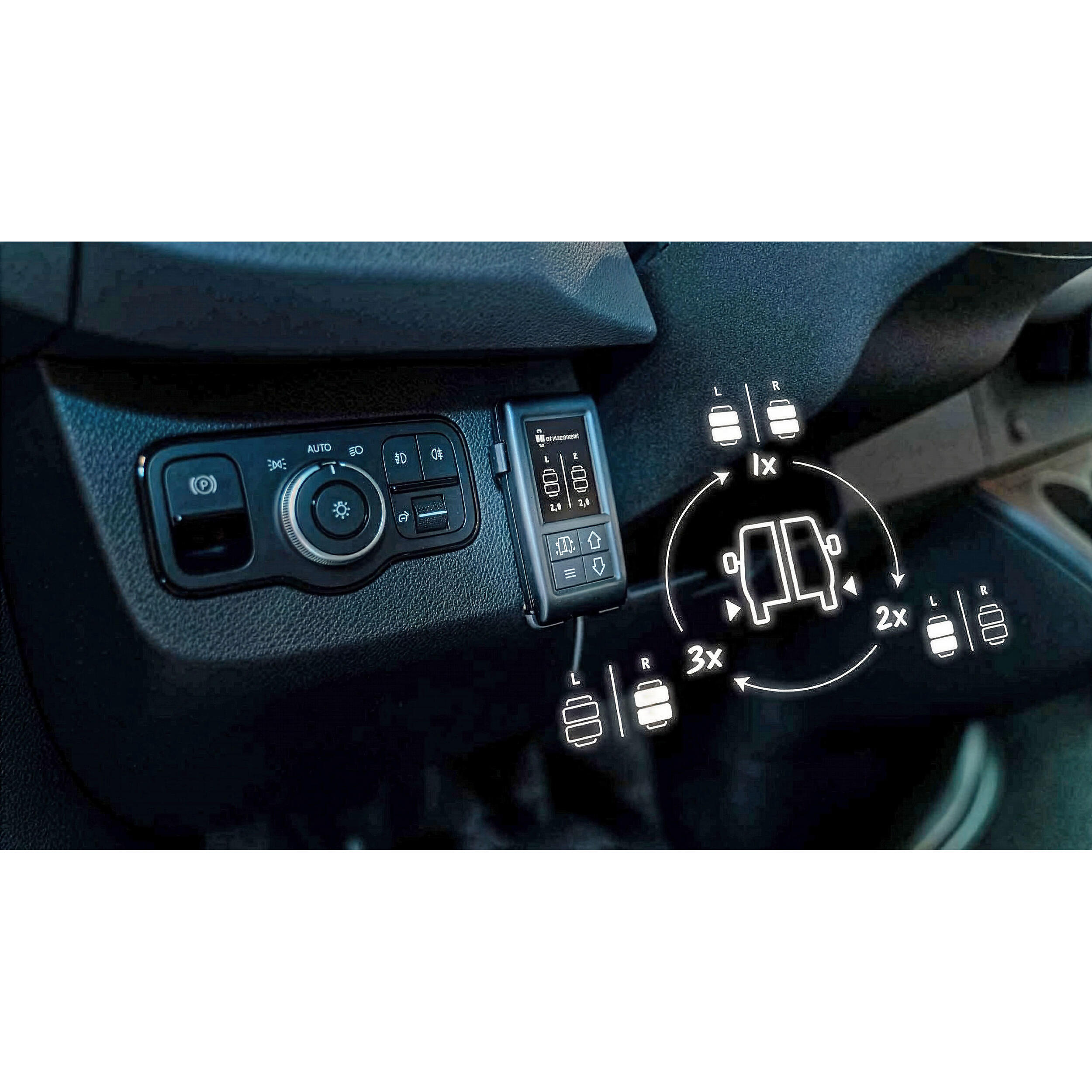 Le panneau de commande spécifique peut être directement intégré au tableau de bord de votre véhicule. Il permet de gérer facilement le gonflage des coussins, offrant un contrôle précis et pratique à portée de main.