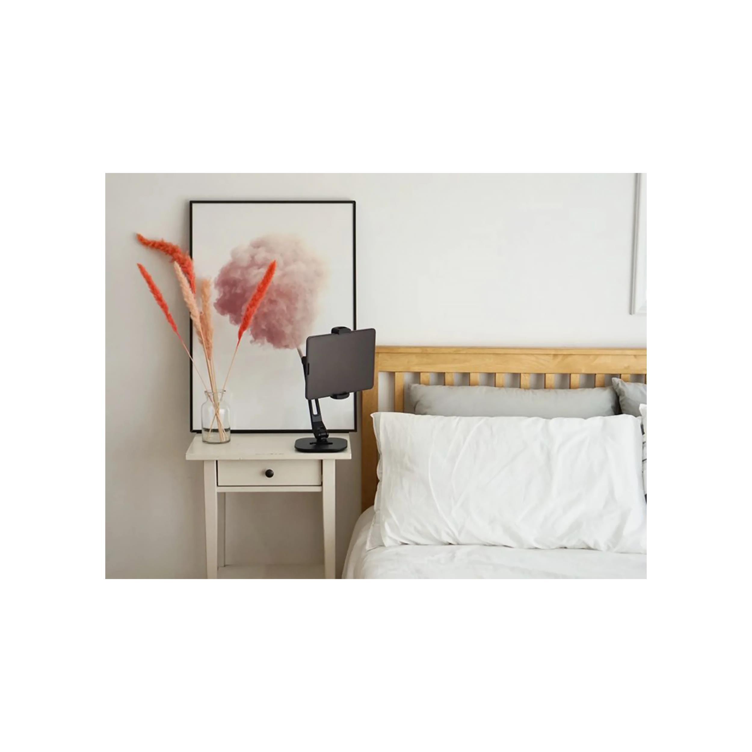 - Support plateforme Stand : une fois le bras articulé verrouillé grâce au système Easy Lock sur cette base, posez votre appareil sur le plan de travail de la cuisine, sur la table à manger, sur la table de camping ou encore sur le matelas pour visionnez et partagez vos contenus multimédias.
