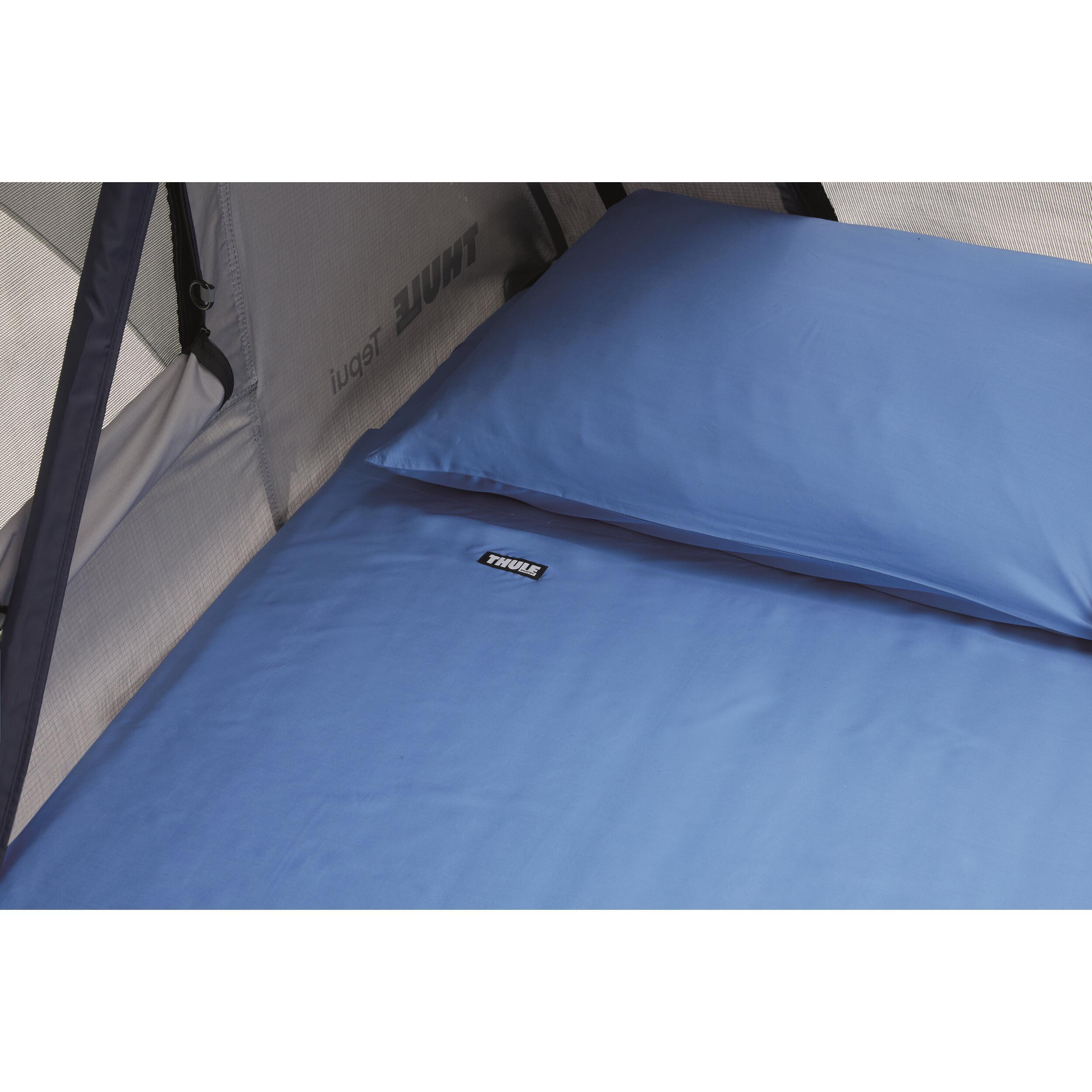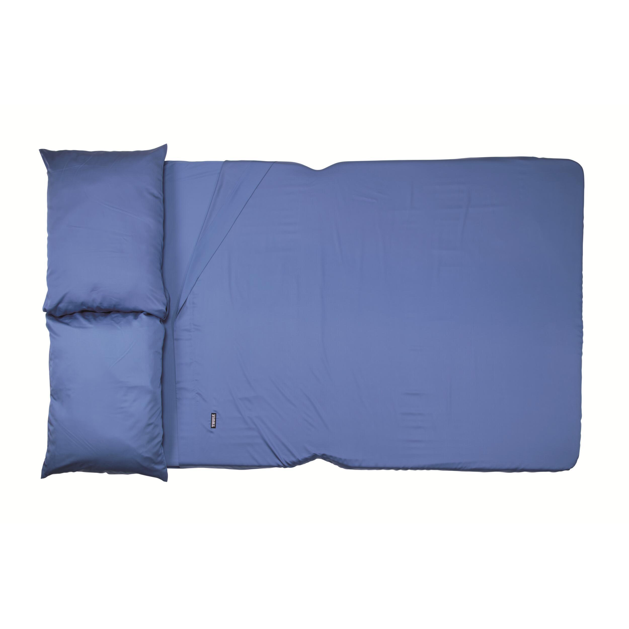 Ensemble de draps Thule pour tente de toit, comprenant drap-housse, drap plat et taies d'oreiller en fibre de bambou, en bleu.