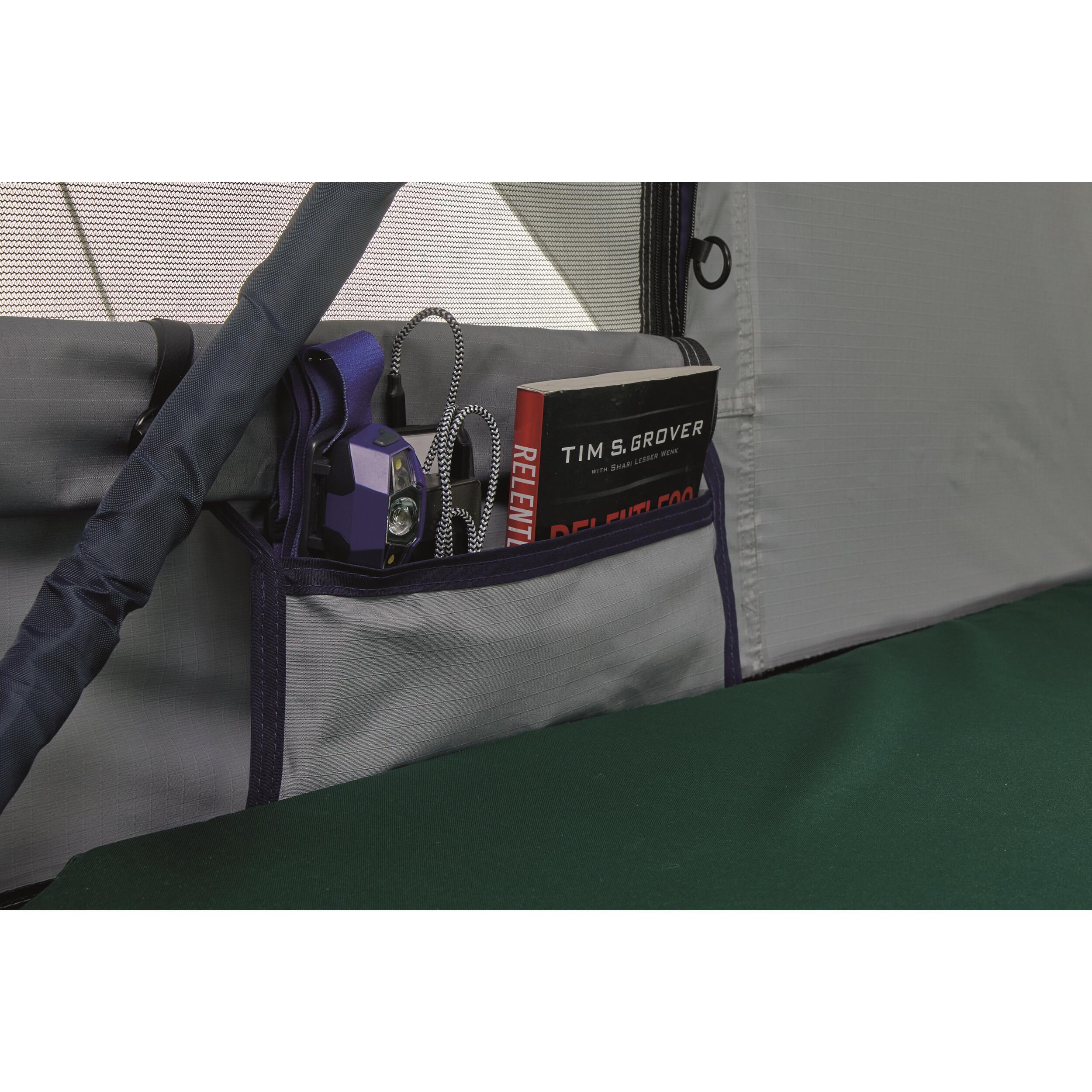 L'intérieur est conçu pour maximiser le confort et l'espace. Avec un matelas en mousse haute densité de 6 cm d'épaisseur, vos nuits seront aussi reposantes que dans votre propre lit. Les quatre grandes poches internes offrent un espace de rangement généreux pour vos équipements et accessoires de camping, rendant votre séjour organisé et agréable.