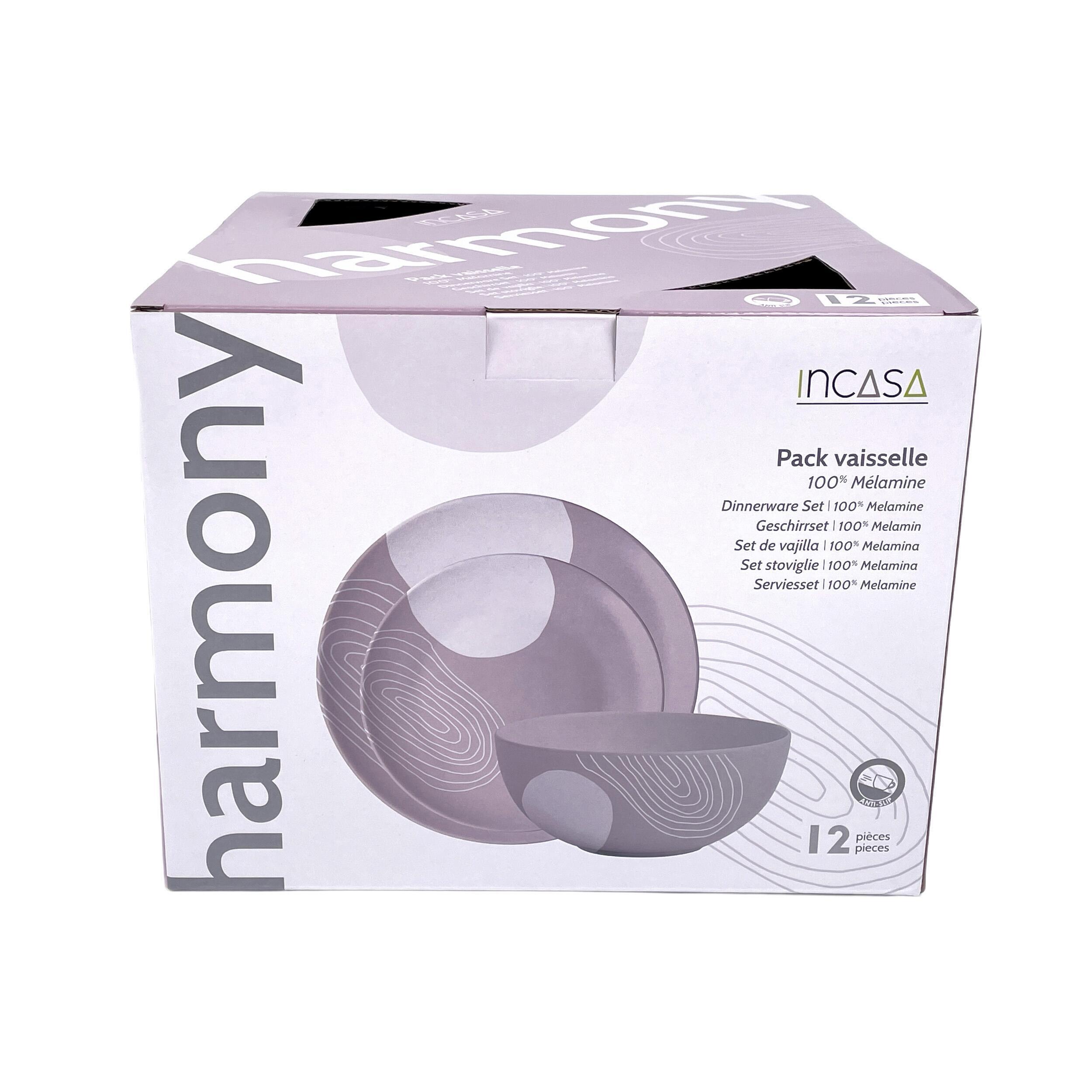 Pack vaisselle mélamine Harmony Incasa sans BPA 12 pièces, design moderne et résistant. Idéal pour 4 personnes en camping-car, van ou caravane. Léger, pratique et compatible lave-vaisselle (panier supérieur).