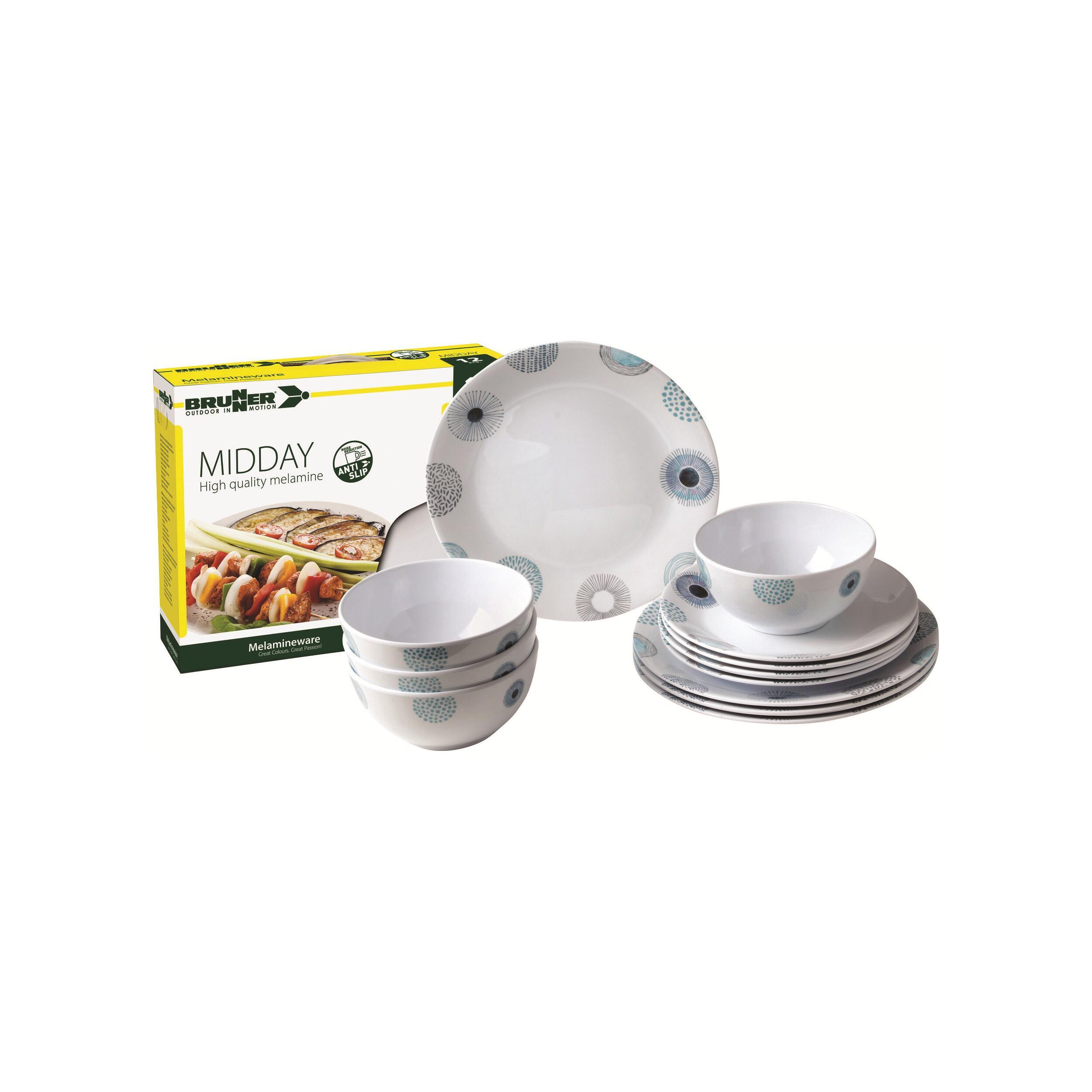 Pack vaisselle en mélamine constitué de 12 pièces : 4 assiettes diamètre 25 cm, 4 assiettes diamètre 20 cm et 4 bols diamètre 15 cm.