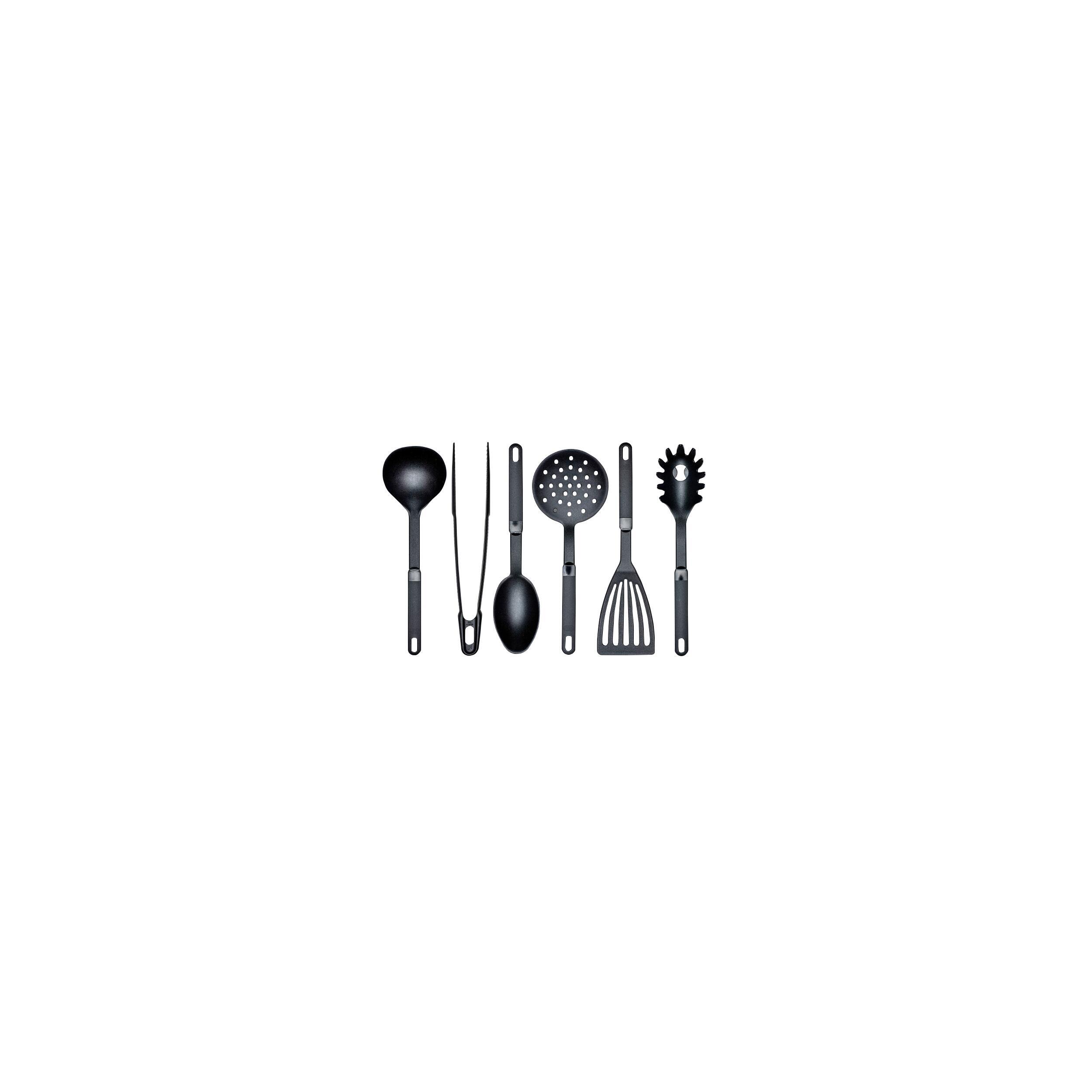 Le set se compose de 6 ustensiles utiles pour la cuisine nomade. Il comprend une louche, un écumoire, une spatule, une pince à pâtes, une cuillère de service et une pince. Tout le nécessaire pour préparer des repas en déplacement.